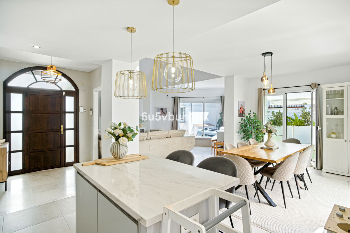 Charmante maison de ville de trois chambres, exposée sud-est, située dans le complexe Sunny Hills, un quartier résidentiel paisible de Riviera del Sol. Cette maison se distingue par ses intérieurs lumineux et spacieux, ses hauts plafonds et son agencement pensé pour le confort. La cuisine ouverte s'intègre harmonieusement à la pièce à vivre, créant une atmosphère chaleureuse idéale pour la vie quotidienne ou pour recevoir des invités. De là, vous avez un accès direct à une terrasse et un jardin privés offrant une intimité totale.