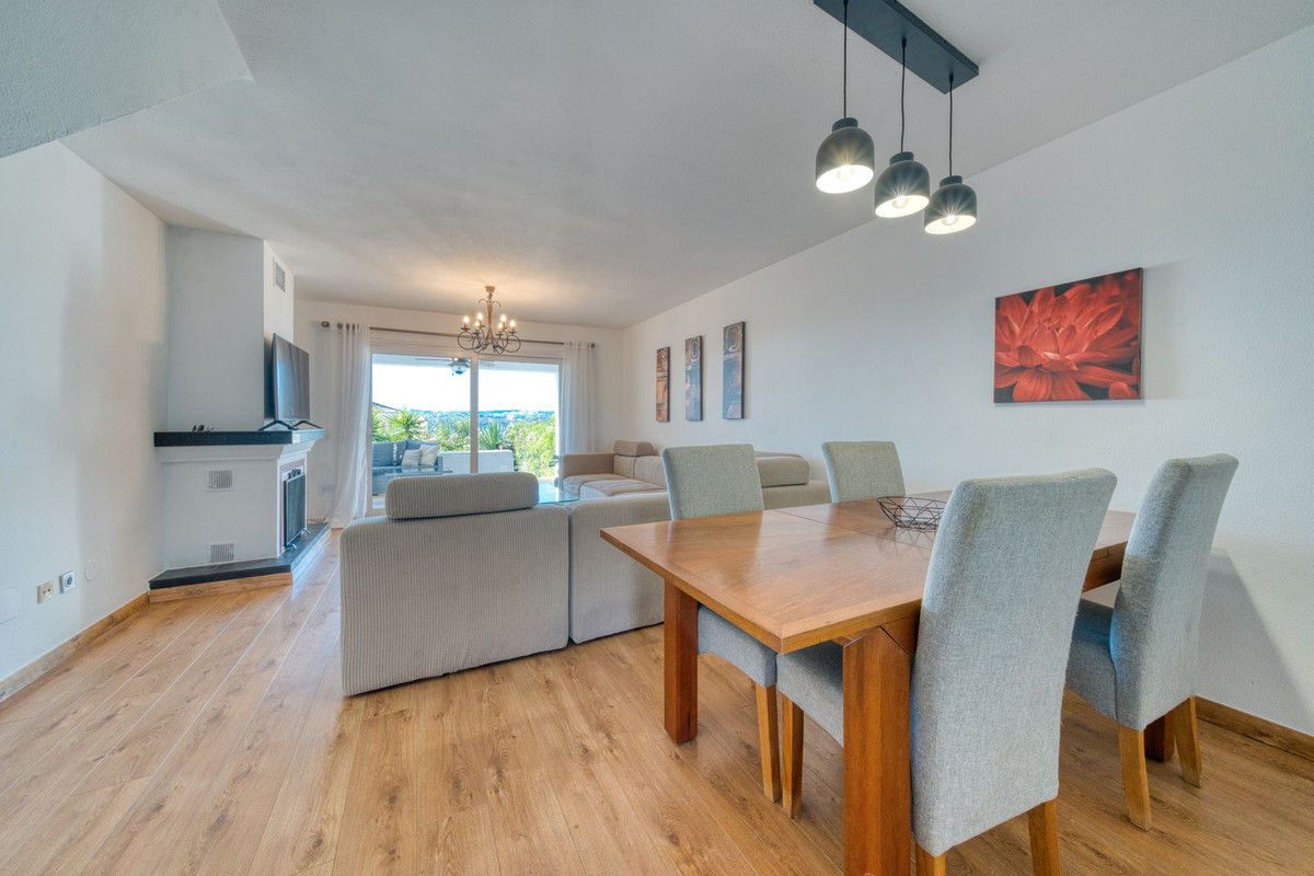Impeccablement présentée et bénéficiant d'une orientation sud-ouest privilégiée, cette élégante maison de ville de deux chambres offre une vue imprenable sur le golf de La Duquesa et la mer Méditerranée. Située dans un quartier paisible et recherché, à proximité de la marina et du golf environnant, la propriété allie confort, espace et commodités, tout en étant à seulement 15 minutes à pied de la plage et du port de plaisance animé de Puerto de la Duquesa, avec ses bars et restaurants. Le rez-de-chaussée comprend une grande cuisine entièrement équipée et une salle de petit-déjeuner avec buanderie attenante et toilettes invités. Un spacieux salon-salle à manger s'ouvre sur une généreuse terrasse couverte, idéale pour dîner en plein air tout en profitant de la vue panoramique. Un escalier descend vers un jardin privé, conçu pour profiter du soleil et se détendre toute l'année. À l'étage, se trouvent deux chambres doubles avec placards intégrés et deux salles de bains modernes, dont une suite parentale avec salle de bains privative offrant une vue imprenable. La suite parentale dispose d'une terrasse intégrée à la chambre, mais pourrait très bien être reconvertie en terrasse. Les avantages supplémentaires comprennent un parking privé hors route, un grand espace de rangement avec un placard en bas et un grenier (qui pourrait également être converti en 3ème chambre) et l'accès à des jardins communs magnifiquement entretenus avec deux piscines, dont une piscine pour enfants.