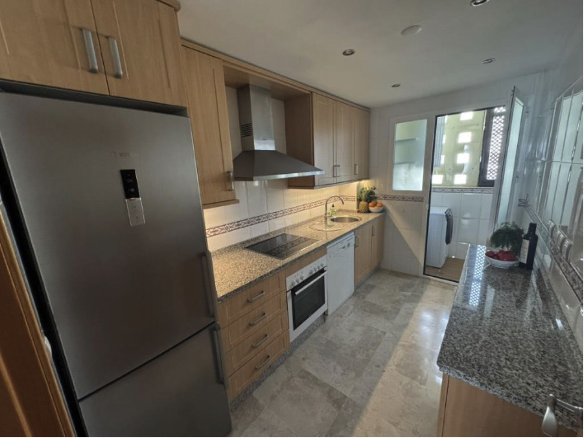 Entrez dans un hall accueillant qui dessert un spacieux salon et une cuisine entièrement équipée, tous deux ouvrant sur une terrasse privée offrant une vue panoramique sur l'océan, les montagnes (jusqu'à Marbella et l'emblématique pic de La Concha), les jardins luxuriants et les piscines étincelantes. Par temps clair, le Maroc se dessine à l'horizon. La chambre principale dispose d'une salle de bains attenante, tandis que la seconde chambre bénéficie d'un balcon à la française pour profiter du soleil de l'après-midi. De nombreuses améliorations ont été apportées, notamment des plafonniers encastrés dans les pièces principales, un buffet de cuisine intégré offrant un espace de rangement supplémentaire et une buanderie vitrée. La propriété est vendue entièrement meublée, telle que vue (avec quelques exceptions mineures), avec notamment une serrure connectée Bold pour un accès contrôlé par application, un meuble TV avec TV, Apple TV et son surround, un lave-linge/sèche-linge intégré, une machine à café, une bouilloire, un grille-pain, un mixeur et tous les ustensiles de cuisine essentiels. L'éclairage connecté Philips Hue avec détecteur de présence et hub assure l'automatisation, tandis que des crochets muraux pour vélos offrent un rangement pratique.