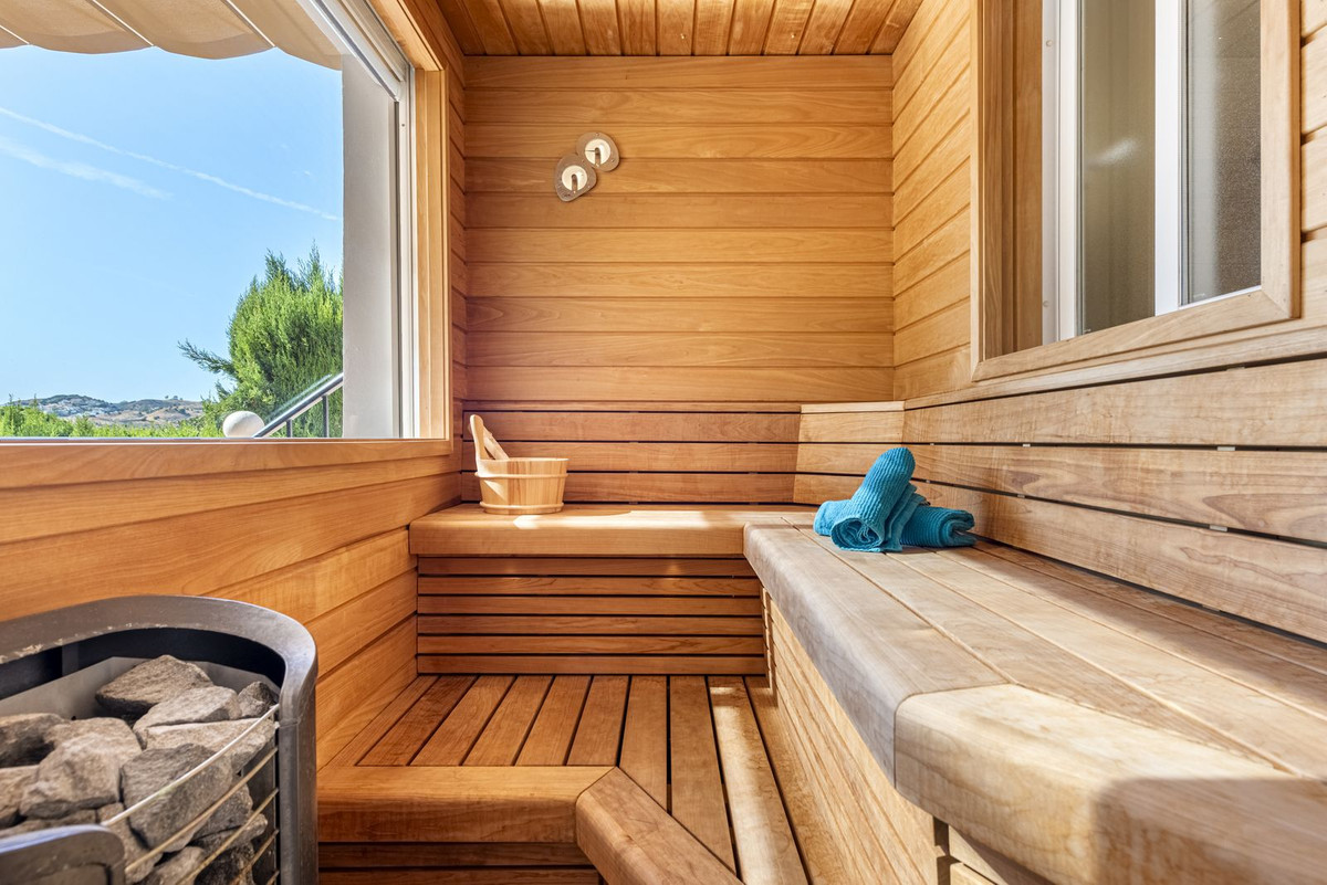Vous trouverez également un sauna avec système audio intégré et une vue sur le jardin pour les journées plus fraîches d'hiver. Le garage, équipé d'une porte électrique et de la climatisation, sert actuellement de salle de sport et de rangement pratique. Un parking supplémentaire est disponible dans l'allée, sous un auvent pratique.