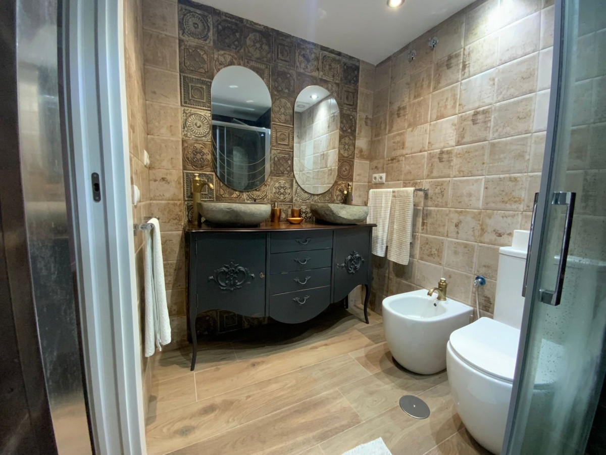 Deux salles de bains : celle de la chambre principale est équipée d'un receveur de douche en ardoise, d'une colonne d'hydromassage avec jets de pluie et d'un pare-douche en verre. Vasques en pierre naturelle.