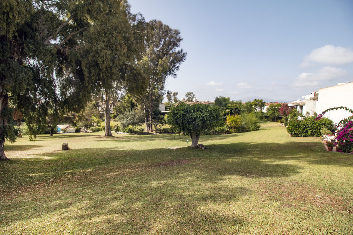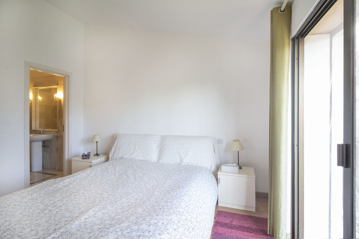 Depuis le salon, des portes coulissantes mènent à une terrasse couverte avec rideaux de verre, offrant un espace extérieur polyvalent idéal pour se détendre ou recevoir en toute saison. La terrasse offre une vue sur les jardins communs impeccablement entretenus, entourés d'une végétation luxuriante et d'une grande piscine, qui vous invitent à profiter pleinement de l'art de vivre de la Costa del Sol.