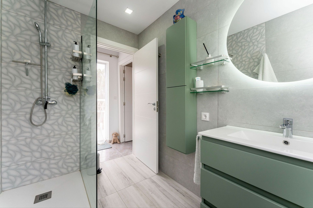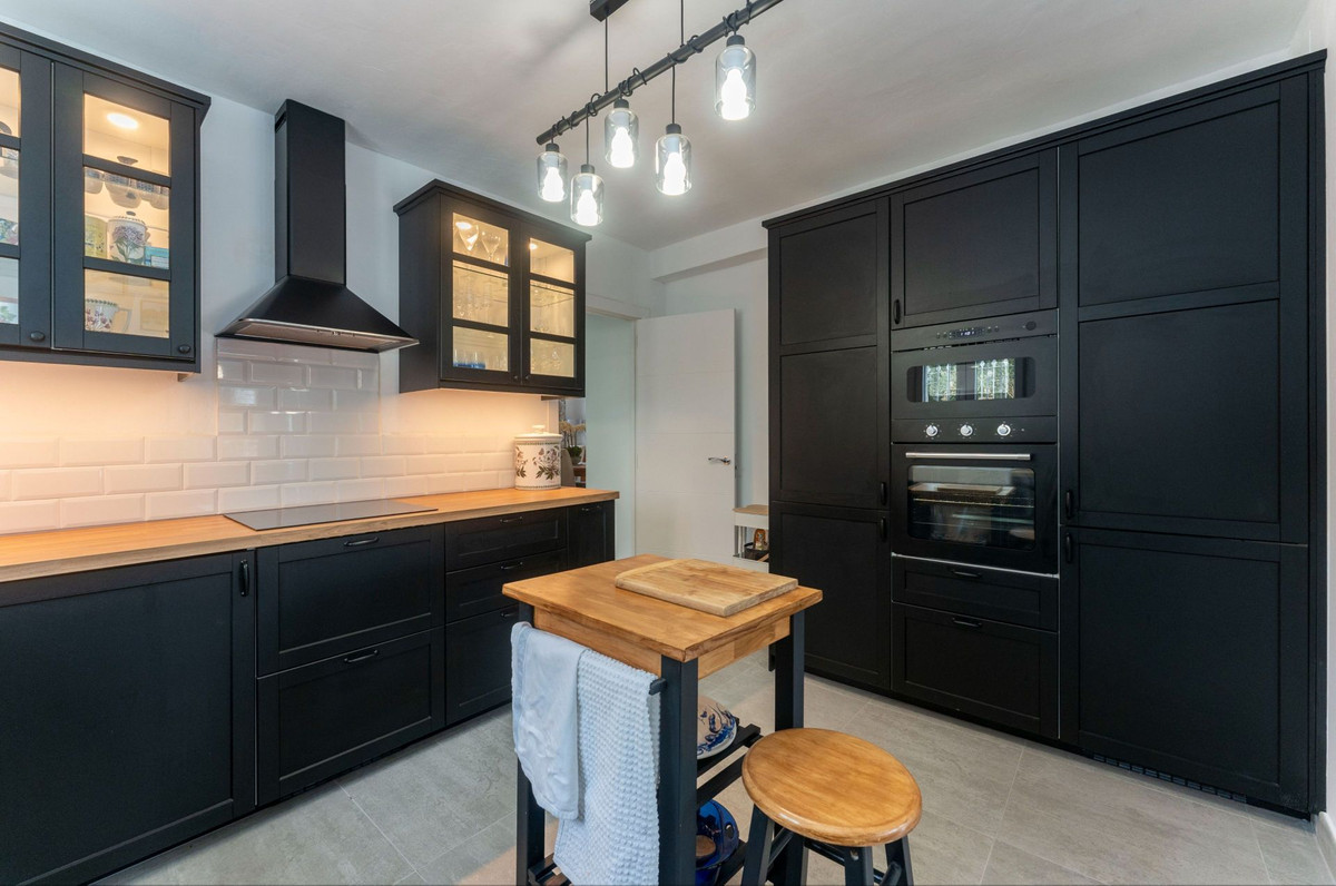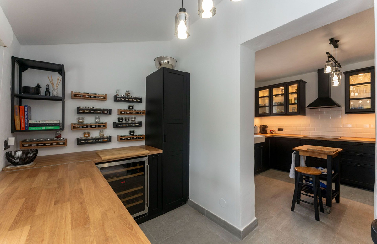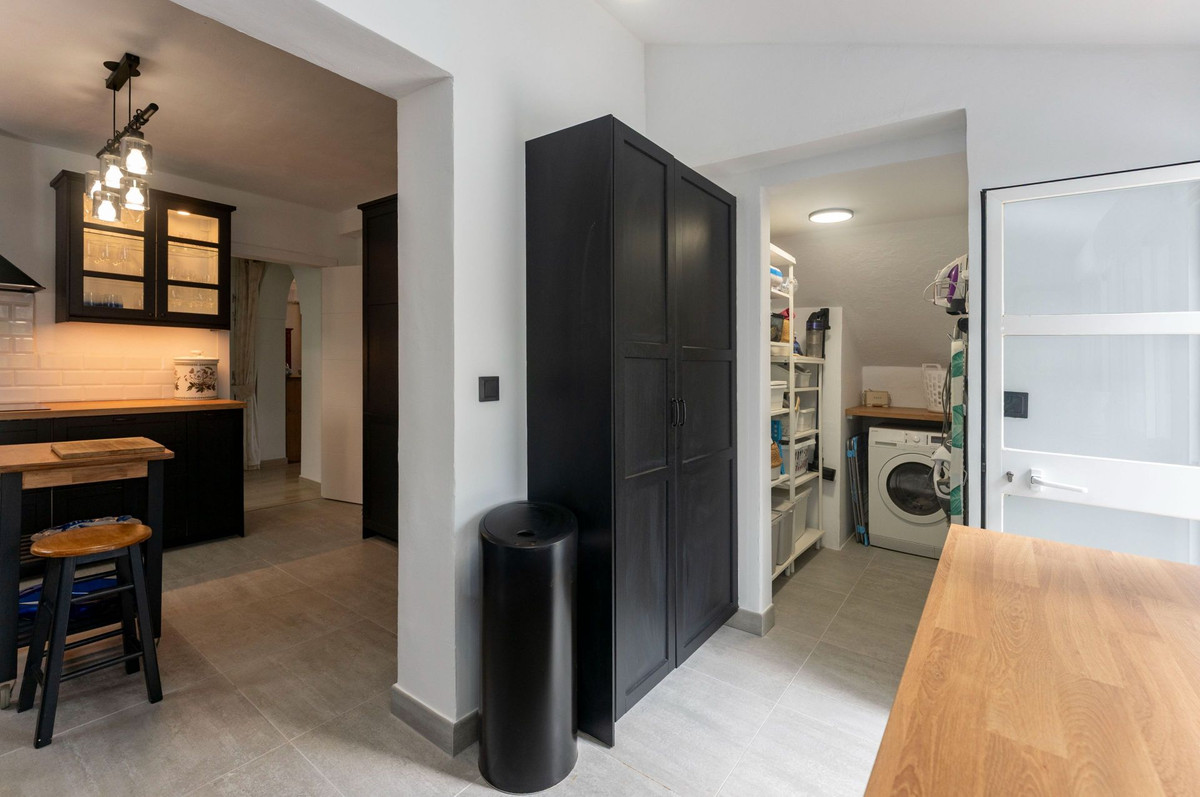 Le rez-de-chaussée dispose d'une spacieuse terrasse couverte, idéale toute l'année, qui mène à un salon-salle à manger lumineux et aéré. De là, une arche mène à une chambre double avec de nombreux placards, une salle de bain entièrement équipée avec baignoire et une cuisine spacieuse avec buanderie séparée. Cette buanderie offre des rangements supplémentaires et un accès direct à la piscine et à la cuisine d'été, créant ainsi une ambiance conviviale pour les réceptions en plein air.
