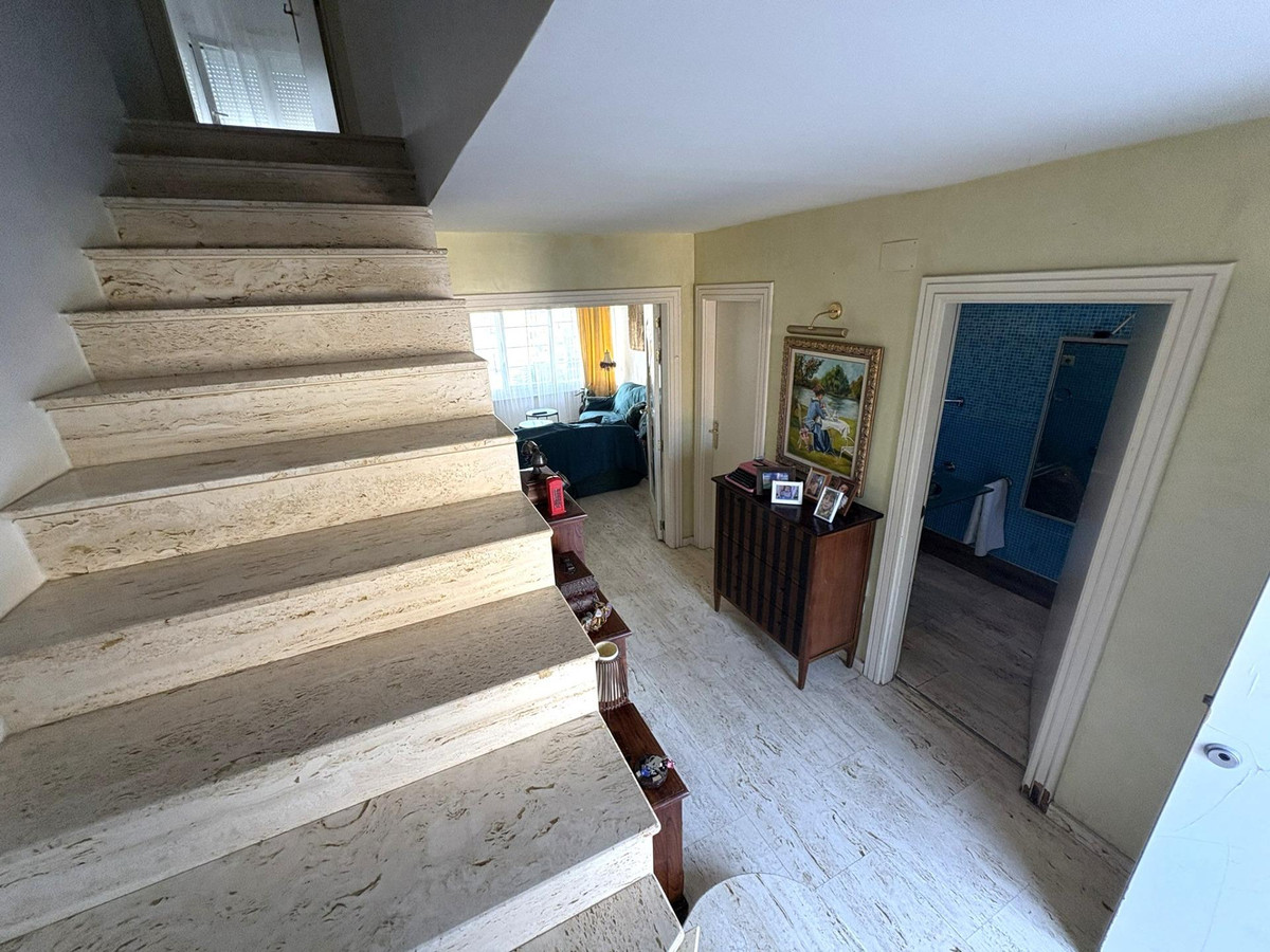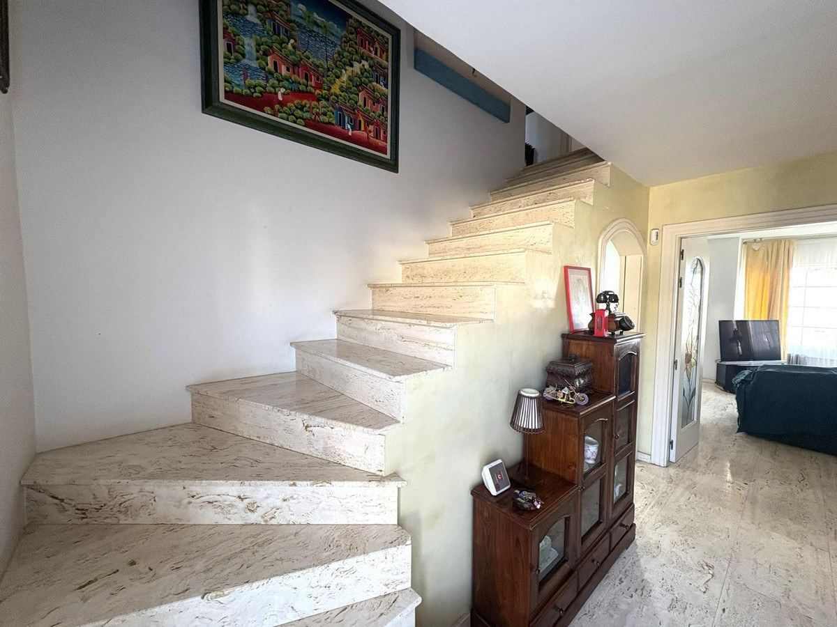 La propriété est répartie sur deux étages. L'étage supérieur comprend trois chambres lumineuses et spacieuses, idéales pour le repos et le confort. Au rez-de-chaussée, vous trouverez un grand hall d'entrée élégant, sublimé par un sol en travertin romain qui lui confère une touche classique et raffinée.