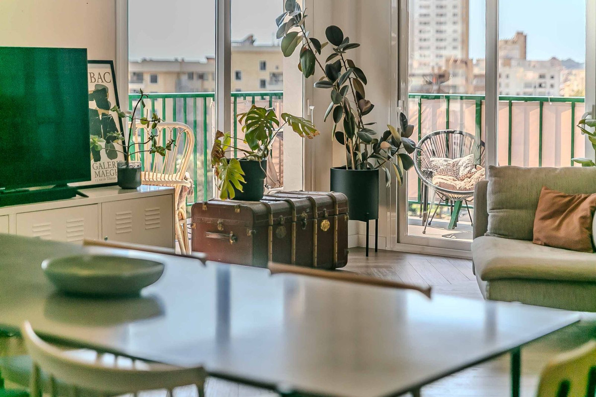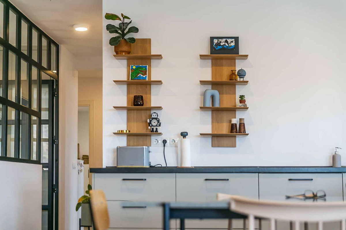 La propriété comprend trois chambres doubles, deux salles de bains modernes et un salon-salle à manger avec cuisine intégrée baignée de lumière naturelle. La troisième chambre, vitrée et communicante avec le séjour, est idéale comme bureau ou chambre d'amis, offrant ainsi une grande polyvalence à l'espace. Une buanderie pratique, dissimulée derrière des lattes de bois, préserve l'ordre et l'esthétique de l'appartement. Chaque détail a été pensé pour offrir confort et style contemporain, avec des finitions élégantes et un agencement fonctionnel.