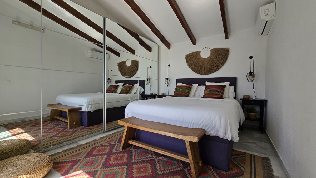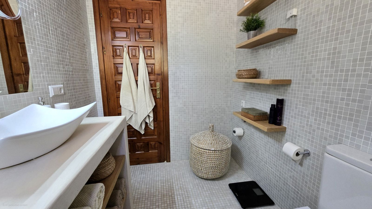 La chambre principale donne sur les terrasses et bénéficie d'une grande salle de douche moderne attenante. Les deux autres chambres disposent également d'une salle de douche moderne. Toutes les chambres sont équipées d'une climatisation individuelle neuve. La propriété comprend également une petite terrasse enveloppante à l'arrière, avec une buanderie fermée.