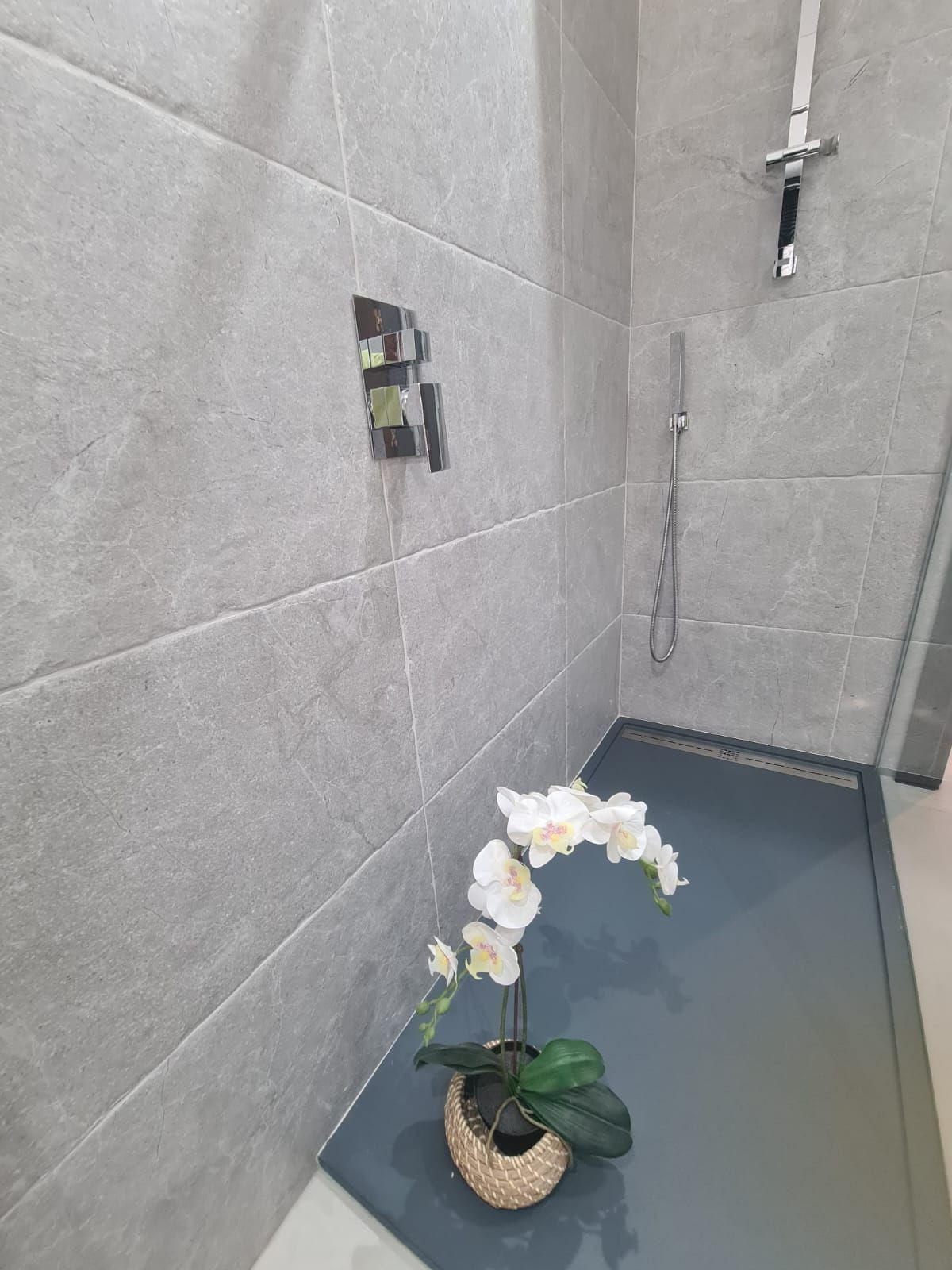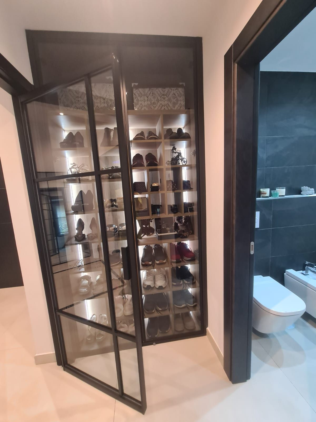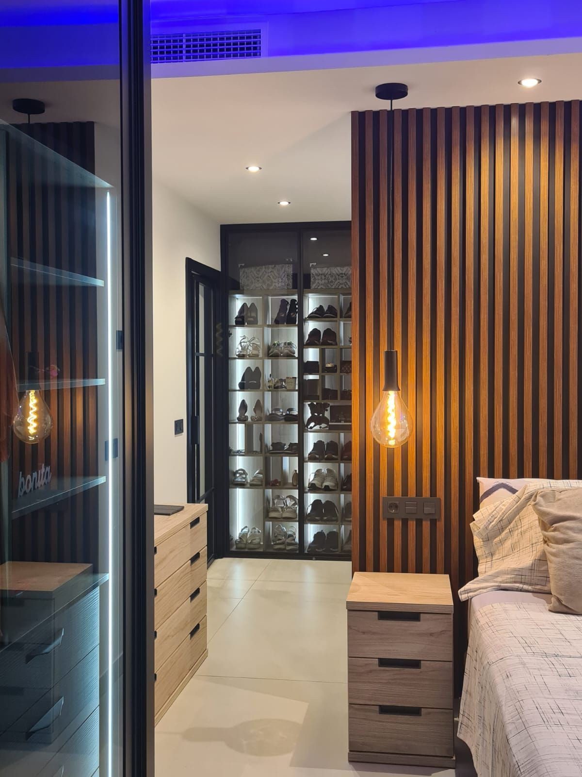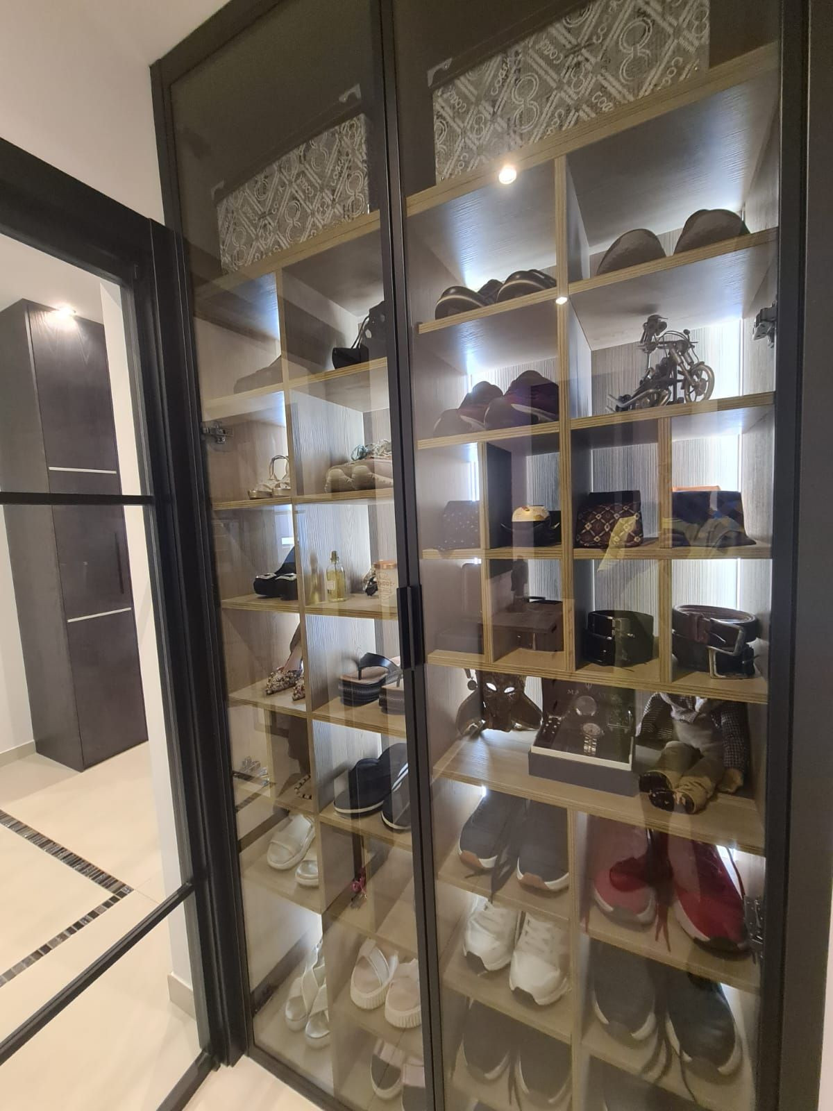 Suite parentale avec dressing vitré éclairé et rangement à chaussures. Salle de bains moderne avec baignoire élégante et douche à l'italienne.