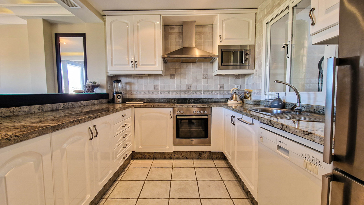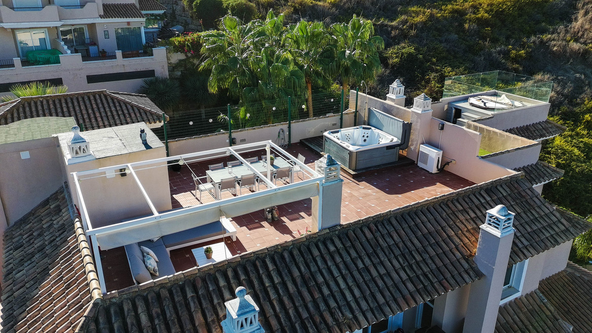L'espace de vie ouvert se prolonge harmonieusement sur une terrasse privée offrant une vue panoramique imprenable sur le paysage environnant. Un solarium impressionnant, équipé d'une cuisine d'été et d'un jacuzzi, offre un espace extérieur supplémentaire idéal pour recevoir ou se détendre, permettant de profiter en toute intimité des douces soirées espagnoles. De plus, vous bénéficierez de plusieurs piscines communes et de jardins luxuriants et soignés au sein de l'ensemble résidentiel.