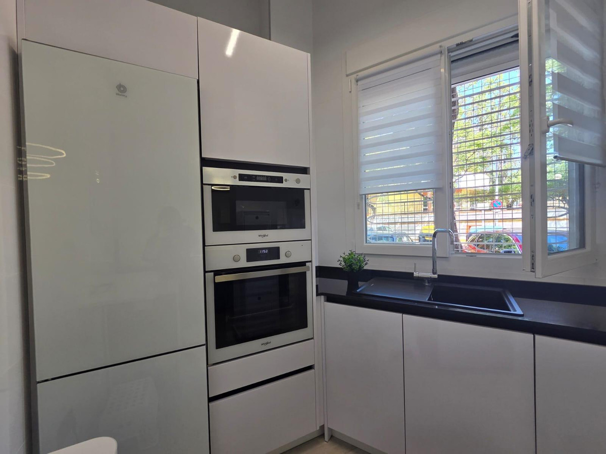 Cuisine américaine entièrement équipée : plan de travail en Silestone, plaque de cuisson vitrocéramique, lave-vaisselle, four encastré et hotte aspirante. Elle communique directement avec le séjour, créant ainsi un espace ouvert et convivial.
