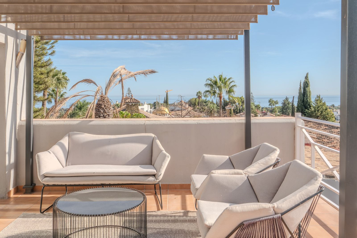 Vie en plein air : Le point fort de la propriété est sa vaste terrasse entourant une piscine privée, offrant une vue imprenable sur la mer, les montagnes et le célèbre parcours de golf de Las Brisas.