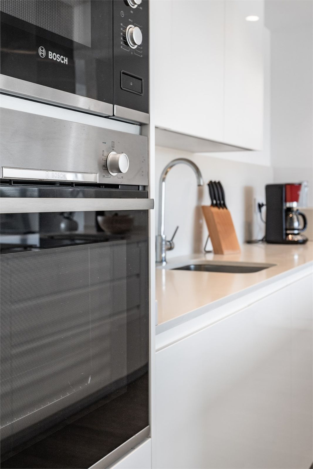 Le séjour, ouvert et accueillant, communique directement avec la grande cuisine équipée d'électroménagers BOSCH haut de gamme. Attenante à la cuisine se trouve une buanderie pratique avec lave-linge et système de chauffage. La surface habitable totale est de 138 m², dont 103 m² de surface utile.