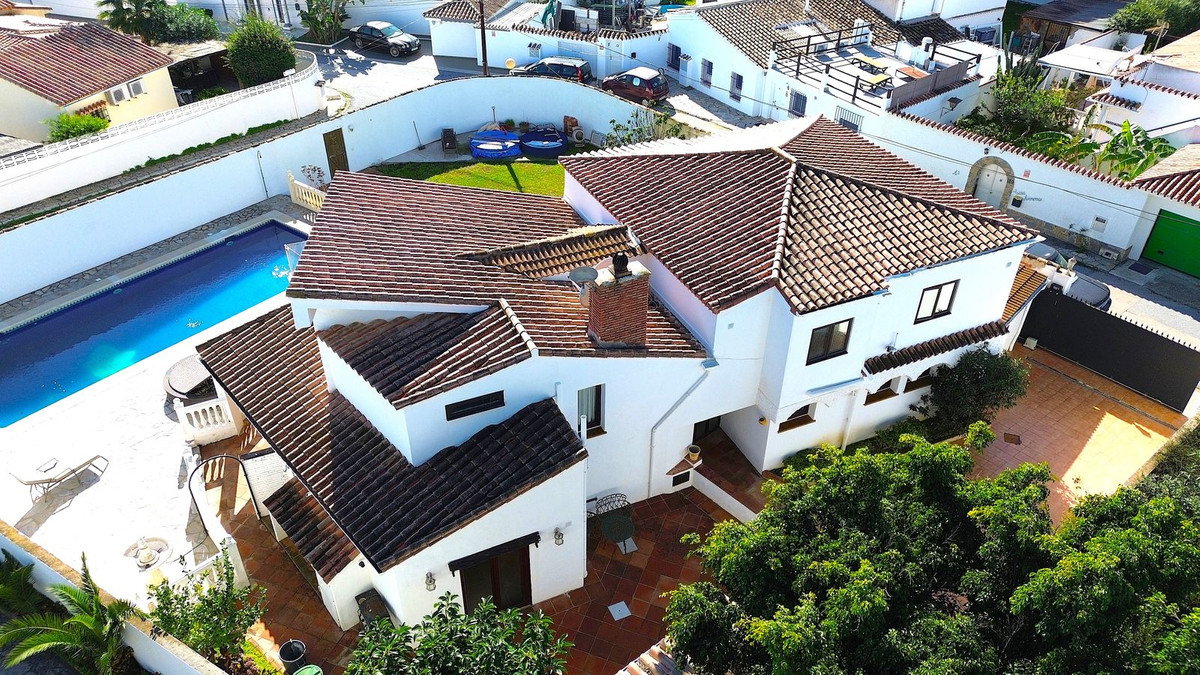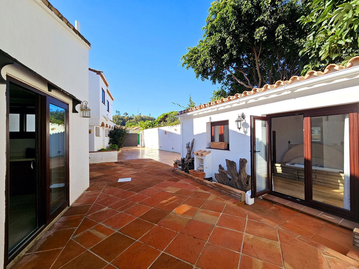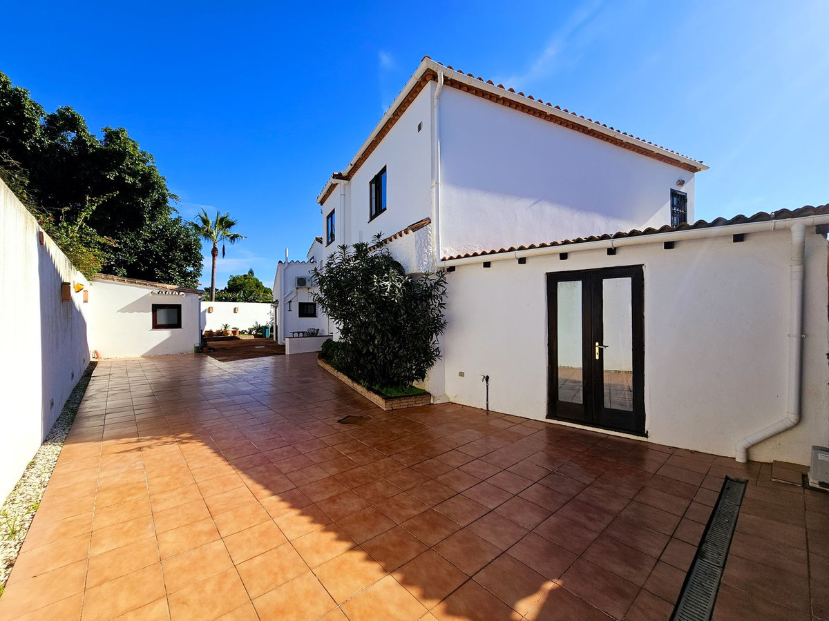 La maison principale comprend 5 chambres, 3 grandes salles de bains rénovées, 2 salons avec cheminées, une vaste cuisine ouverte sur la salle à manger, le tout réparti sur deux étages. Un appartement indépendant avec entrée séparée serait idéal pour le personnel, des adolescents ou des invités. Le terrain de 851 m² est entièrement plat, offrant ainsi un jardin parfaitement exploitable. Ce dernier abrite une très grande piscine et une pelouse, idéale pour une famille avec enfants ou animaux de compagnie. La villa est accessible par un portail automatique, et une porte secondaire au fond du jardin permet un accès plus direct à la plage. Cette propriété a conservé tout son charme andalou avec ses magnifiques poutres apparentes, ses plafonds voûtés et ses carreaux traditionnels.