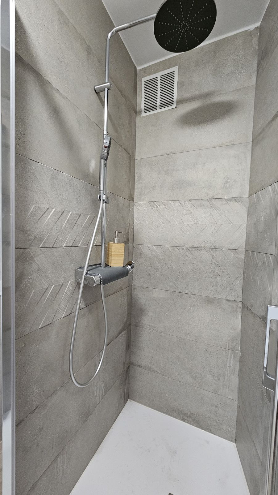 Une autre salle de bain entièrement équipée se trouve dans le couloir, partagée par les deux autres chambres. L'une peut accueillir un lit double et dispose de placards intégrés, tandis que l'autre, plus petite, peut être aménagée en chambre avec un lit simple ou en bureau/espace de rangement.