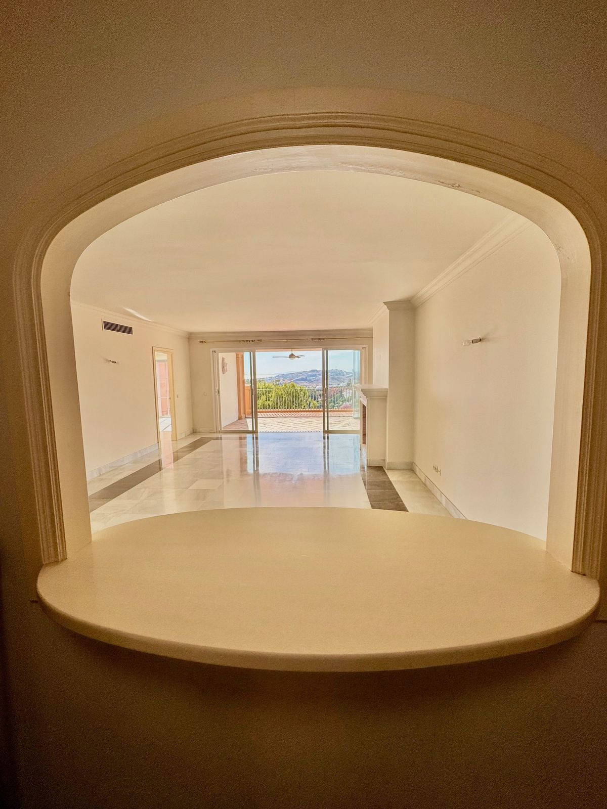En approchant de l'entrée, quelques marches mènent à la porte principale. Une fois à l'intérieur, vous découvrirez un espace de vie et salle à manger spacieux et lumineux, baigné de lumière grâce à ses baies vitrées qui créent une atmosphère chaleureuse. Accédez ensuite à votre vaste terrasse couverte de 22 m², équipée de rideaux de verre, qui vous permettra d'admirer la vue panoramique imprenable sur Benahavís, les majestueuses montagnes environnantes, l'emblématique Rocher de Gibraltar et la mer scintillante. La magnifique vue dégagée au sud-ouest procure une sensation de bien-être tout au long de l'année ; par temps clair, vous pourrez même apercevoir la côte africaine et les montagnes de l'Atlas – un spectacle à couper le souffle ! Les couchers de soleil y sont tout simplement spectaculaires.