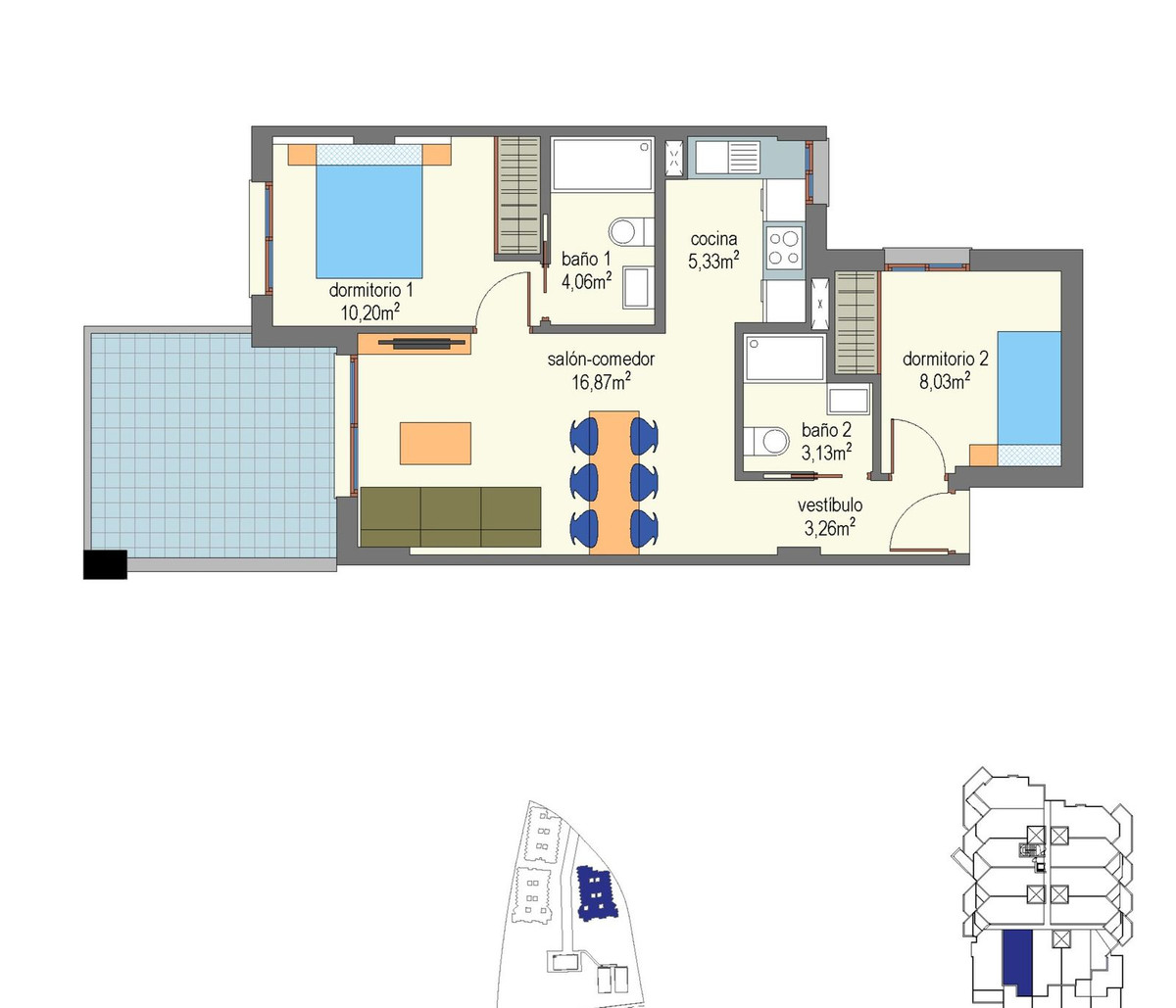 La propriété comprend 2 chambres et 2 salles de bains, réparties dans un espace moderne et fonctionnel baigné de lumière naturelle.