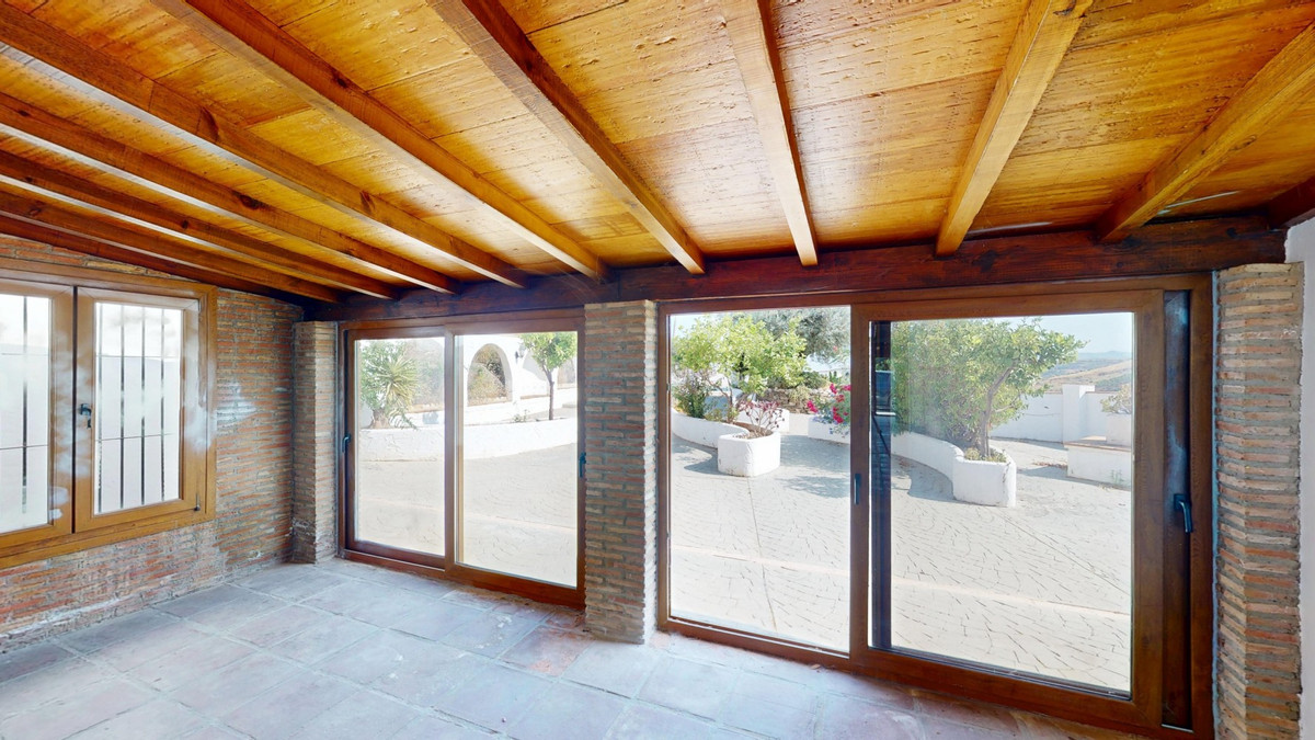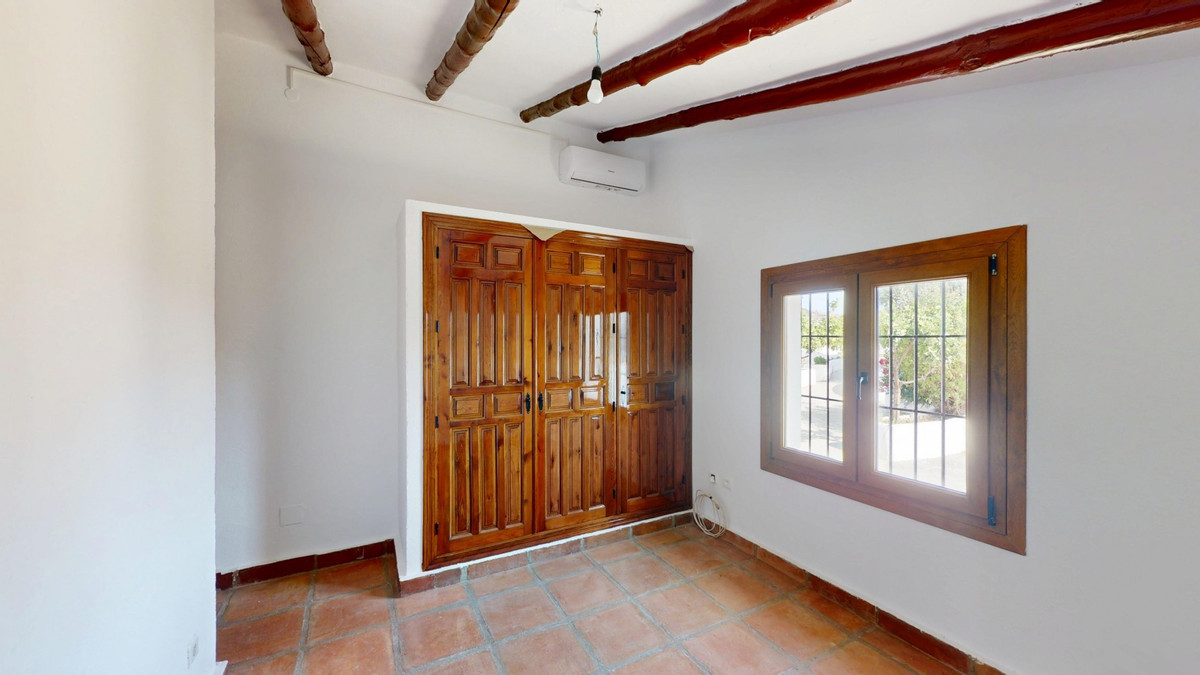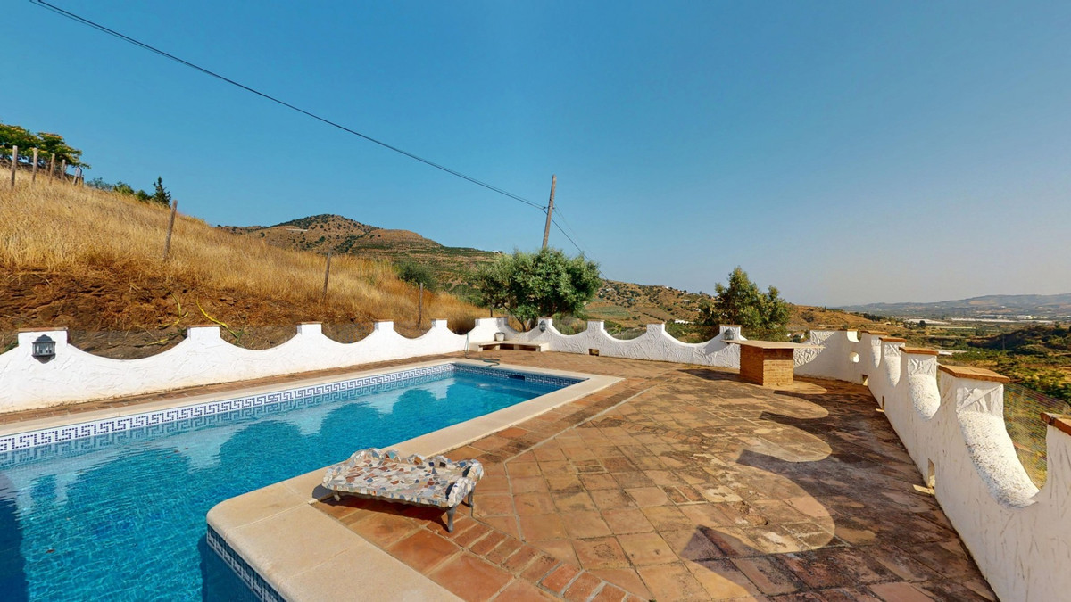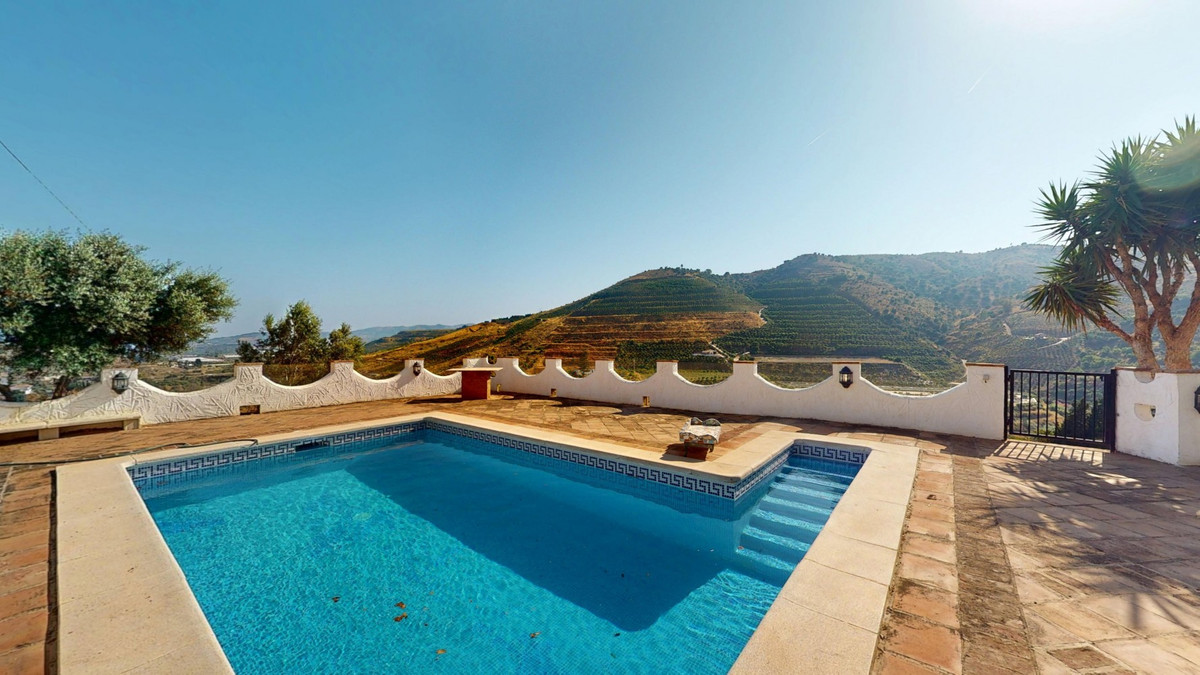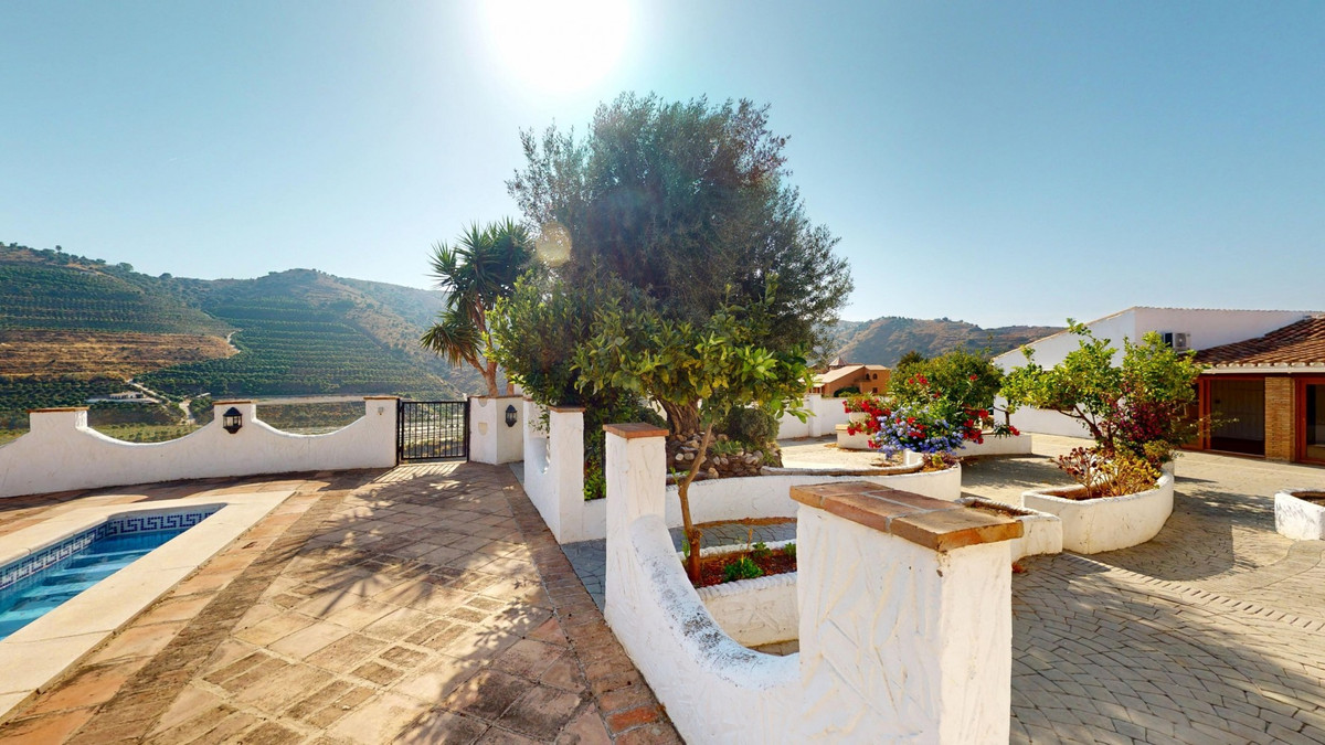This delightful Spanish villa, located in Viñuela, Málaga, offers a perfect blend of traditional charm and modern comfort. The single-story property spans 167 m2 and features three bedrooms, including a spacious 13.9 m2 primary bedroom, and two bathrooms. Upon entering, you're greeted by the home's most striking feature: beautiful terracotta tile flooring that runs throughout, creating a cohesive and authentic Spanish ambiance. The living areas are characterized by their high, sloping ceilings with exposed wooden beams, adding rustic charm and visual interest to the space. The heart of the home is undoubtedly the living room, which boasts a magnificent stone fireplace as its centerpiece. Large windows and glass doors in this area, as well as in the bedrooms, allow ample natural light to flood the interiors while offering picturesque views of the surrounding landscape. The kitchen presents a harmonious blend of traditional and contemporary design. Modern appliances and sleek cabinetry are juxtaposed against the rustic ceiling beams, creating a functional yet aesthetically pleasing culinary space. The bathrooms, while not extensively detailed in the images, appear to have been updated with modern fixtures. Storage is thoughtfully incorporated throughout the home, with built-in wooden wardrobes in the bedrooms that maintain the overall rustic aesthetic. The property also features two patios, offering delightful outdoor spaces for relaxation and entertainment. A unique aspect of this villa is its attention to decorative details, such as the ornate tile borders in the hallways and bathrooms, which add a touch of traditional Spanish flair to the otherwise simple and elegant interiors. Outside, the villa boasts a beautiful pool and a charming outdoor area perfect for enjoying the  Mediterranean climate. Overall, this Málaga villa offers a warm, inviting atmosphere that beautifully marries traditional Spanish architectural elements with modern comforts, creating a truly special living space. We are pleased to be able to present this dream property to you soon, either personally or via virtual viewing. Because this world is unique - just like our Axarquía. In Andalusia. On the Costa del Sol. Here, on the sunny side of life...