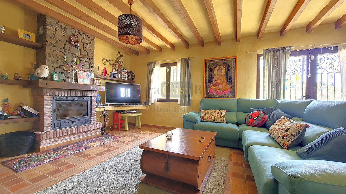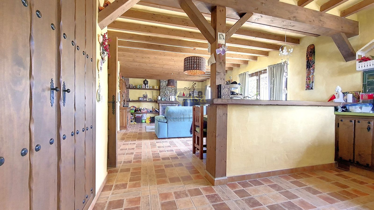 En entrant, on est immédiatement frappé par l'atmosphère chaleureuse et champêtre. Les portes en bois, typiques de l'Andalousie, sont réalisées sur mesure. L'élégant carrelage au sol est d'excellente qualité et les beaux plafonds à poutres apparentes complètent l'ensemble. Au rez-de-chaussée se trouve une salle de bain avec douche et toilettes. À côté, un grand cellier abrite notamment le lave-linge. Plus loin, au bout du couloir, se trouve une chambre spacieuse actuellement aménagée en salle de jeux pour enfants. À droite du couloir, on accède au séjour/salle à manger avec cuisine ouverte entièrement équipée. Cette pièce est agrémentée d'une grande cheminée. Les portes-fenêtres au centre de la pièce donnent sur la terrasse latérale.