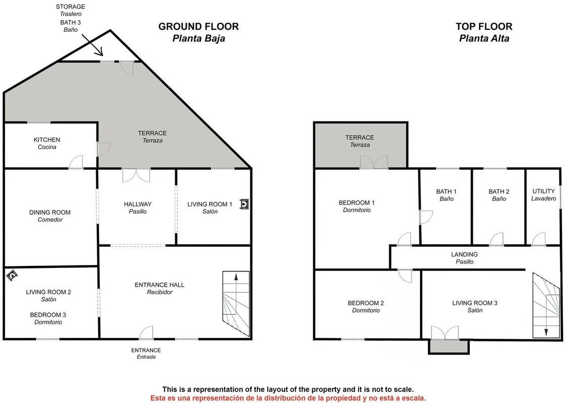 On accède à la maison par un grand hall qui dessert le reste du rez-de-chaussée. À gauche se trouve le second salon avec une cheminée (qui pourrait facilement être transformée en chambre supplémentaire). Le salon principal dispose également d'une cheminée et donne accès à une petite terrasse agrémentée de nombreux pots plantés de divers arbustes.