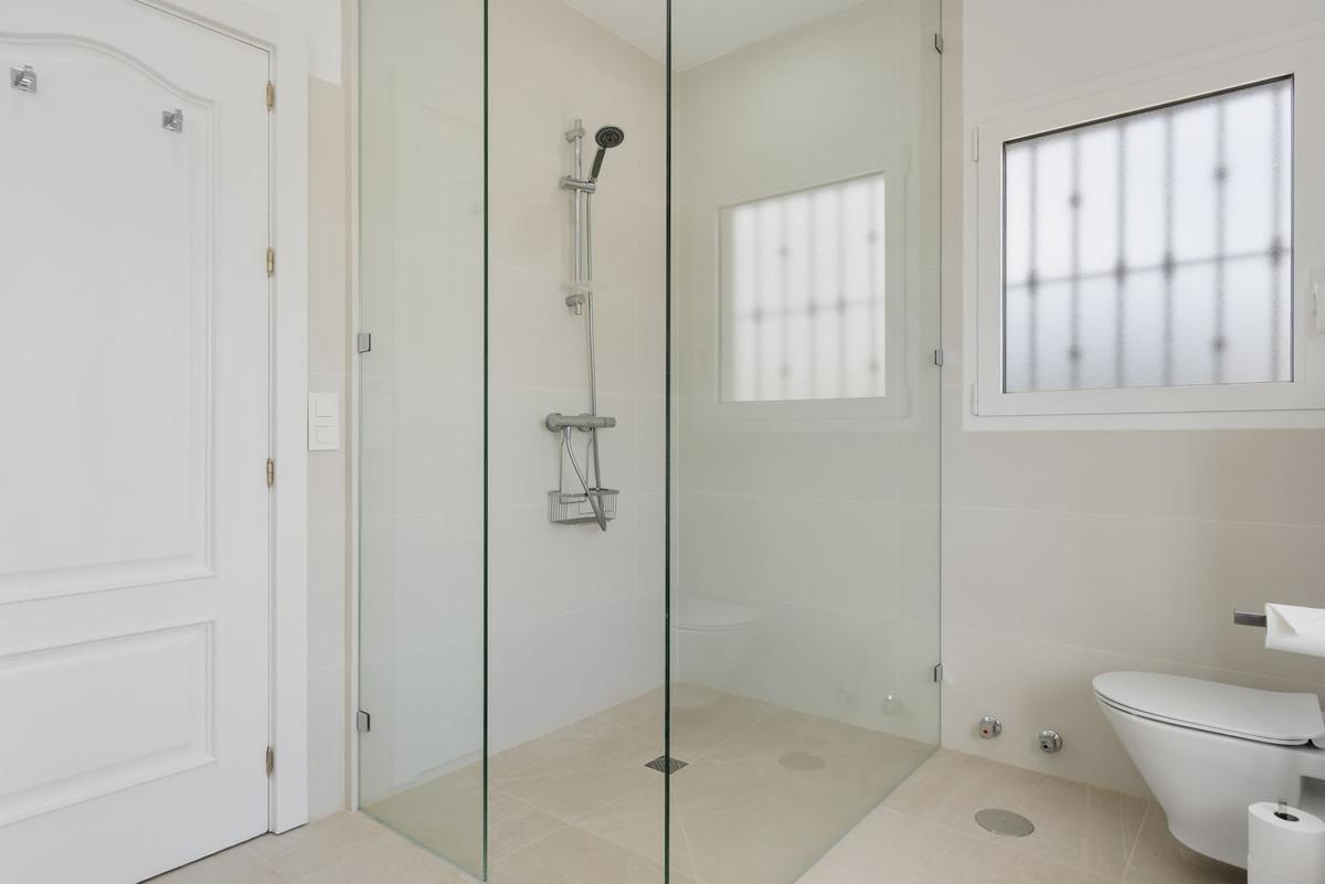 Ascending the staircase, two additional bedrooms reveal themselves, each exuding comfort and elegance. The master suite boasts an ensuite bathroom featuring a luxurious bathtub and shower, accompanied by a generous private terrace boasting great sea views. The fourth bedroom provides a cozy retreat with a double bed and a cute lounge area with a sofa.