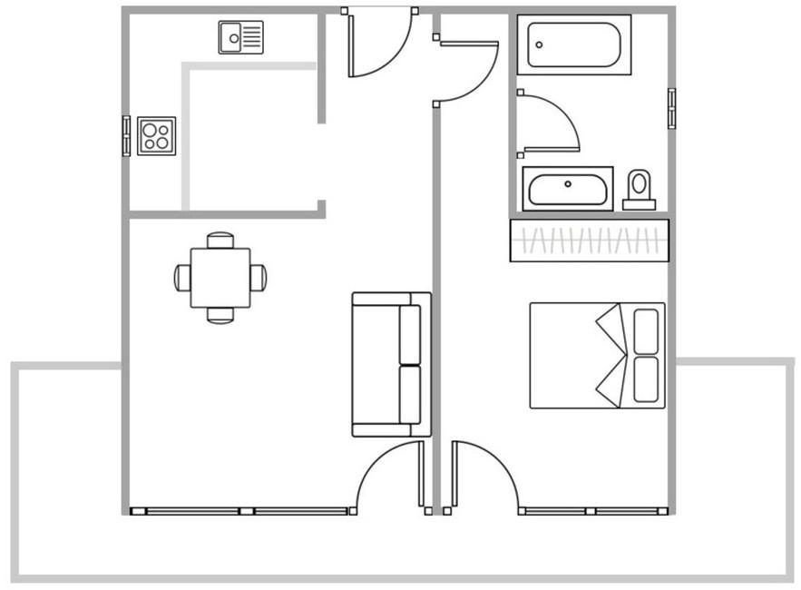 Appartement spacieux d'une chambre comprenant une cuisine indépendante, une salle de bains avec baignoire et une terrasse d'environ 10 m² orientée nord-ouest, idéale pour profiter du soleil de l'après-midi.