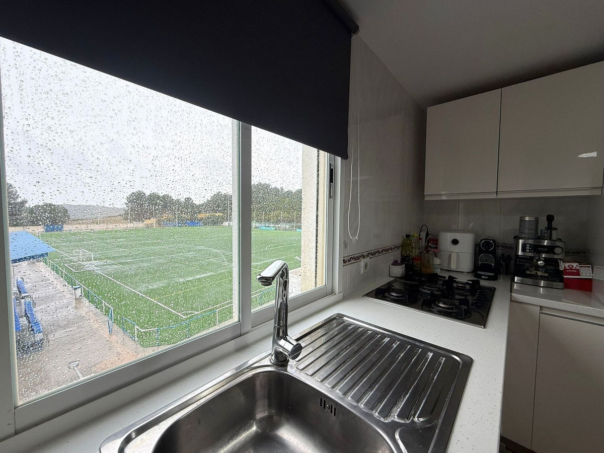 La cuisine offre une vue dégagée sur le terrain de football, baignée de lumière naturelle et créant une agréable sensation d'espace. Elle comprend également une buanderie séparée, un atout pratique supplémentaire au quotidien.