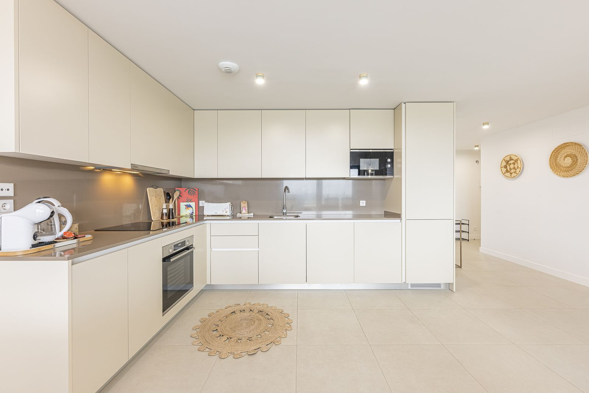 L'espace de vie ouvert, comprenant salon et salle à manger ainsi qu'une cuisine moderne intégrée, constitue le cœur de la maison. De grandes baies vitrées inondent l'intérieur de lumière naturelle et donnent directement sur la terrasse.