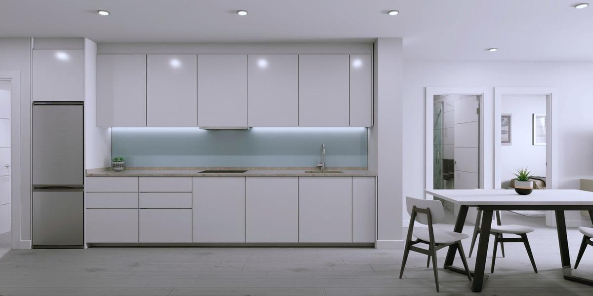 Chaque appartement dispose d'une cuisine entièrement équipée, comprenant des placards hauts et bas ainsi que des appareils électroménagers tels qu'une plaque de cuisson vitrocéramique, une hotte aspirante, un lave-linge et un réfrigérateur, conçue pour le confort et la praticité.
