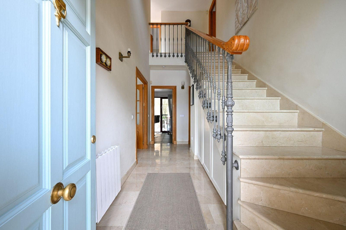 Depuis le jardin de devant, on accède à la propriété et immédiatement au jardin principal et à la piscine, situés sur la gauche. À l'intérieur, un hall d'entrée lumineux et spacieux, avec de hauts plafonds, vous accueille.