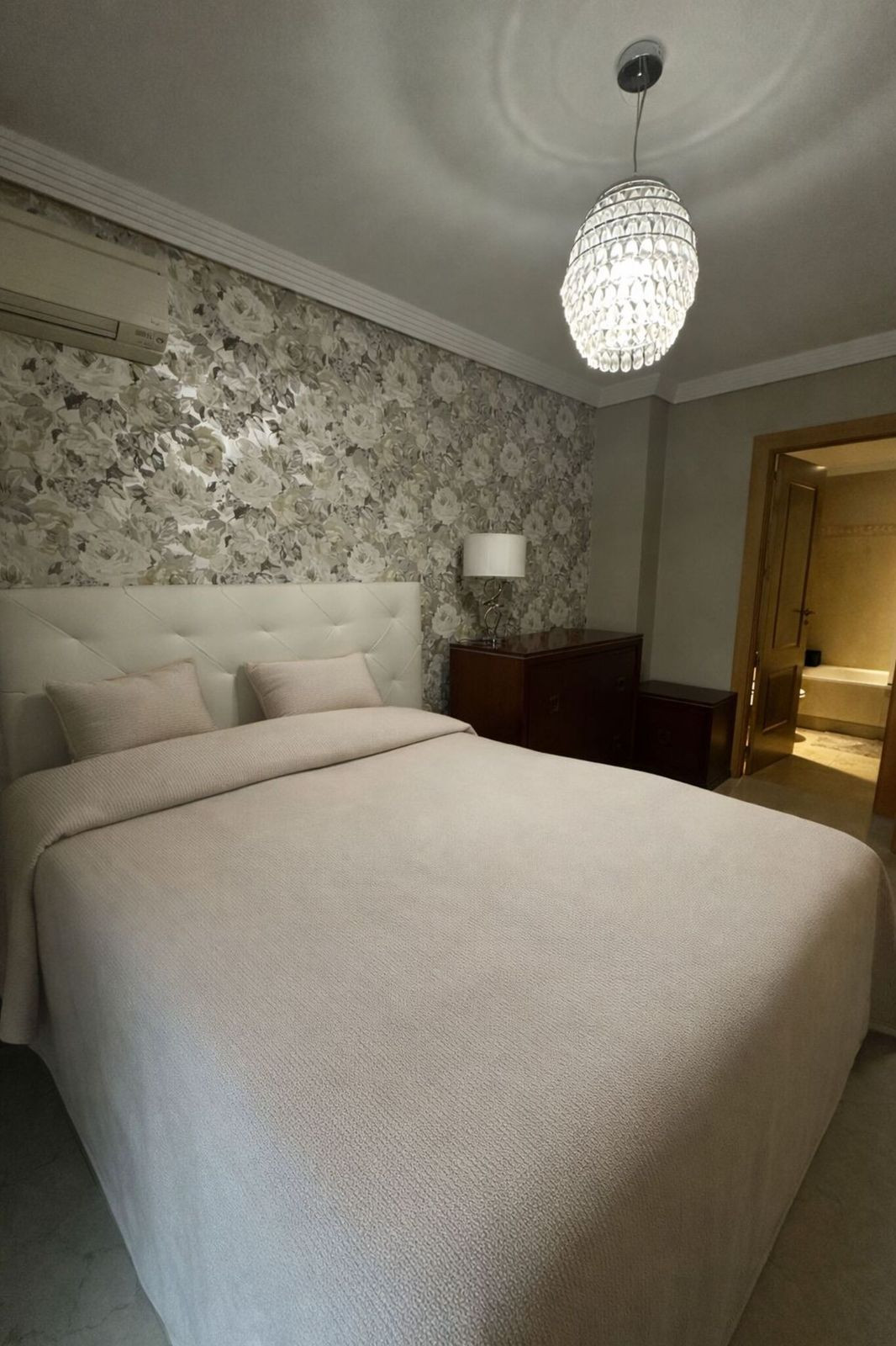 L'agencement intérieur comprend deux chambres et deux salles de bains, dont une suite parentale, un vaste séjour/salle à manger à l'atmosphère chaleureuse et une cuisine séparée aux dimensions généreuses. Le bien a été modernisé avec une cuisine contemporaine, des salles de bains rénovées, des sols de qualité et une esthétique sobre et élégante. Il est équipé de la climatisation, d'un éclairage soigné et de rangements pratiques.