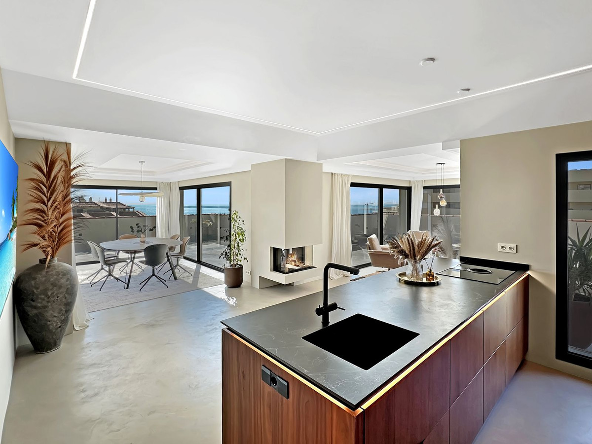 L'agencement ouvert est le cœur de ce penthouse. L'espace de vie intérieur de 135 mètres carrés offre une circulation fluide entre le salon, la salle à manger et la superbe cuisine. Cette dernière arbore d'élégantes finitions en noyer, un plan de travail en composite, des appareils électroménagers entièrement intégrés et un îlot central équipé d'une plaque à induction. Une cheminée accueillante est judicieusement placée pour créer une ambiance chaleureuse et romantique dans le séjour ouvert, notamment en fin de soirée.