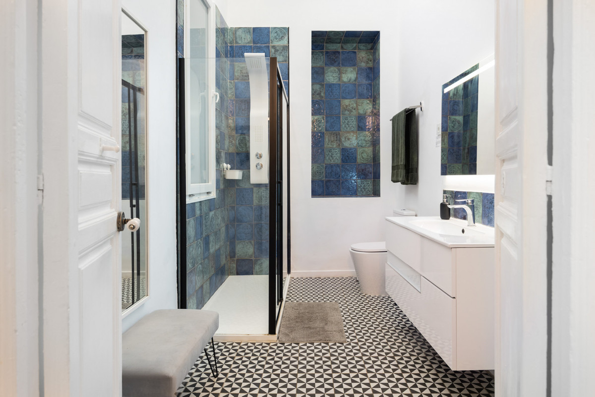 De hauts plafonds de 4,2 mètres avec poutres apparentes, des portes de 3 mètres et des carreaux d'origine du XIXe siècle caractérisent une rénovation haut de gamme qui respecte le patrimoine du bâtiment tout en optimisant le confort au quotidien. Les salles de bains, dignes d'un spa, offrent de beaux volumes et des douches à effet pluie ; la climatisation centrale dessert l'ensemble de l'appartement. Son agencement modulable permet d'aménager un studio indépendant ou un appartement de trois chambres. Actuellement proposé sur Airbnb, il est idéal pour accueillir des invités ou générer un revenu complémentaire en location saisonnière.