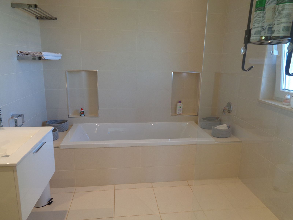 La salle de bains attenante comprend une baignoire, une douche séparée, des toilettes, un lavabo et un sèche-serviettes. Depuis la terrasse, admirez la vue spectaculaire sur le jardin soigné, la vallée et les montagnes environnantes.