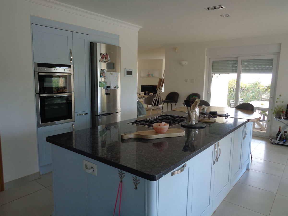 Un bel espace repas sépare le salon de la cuisine. La cuisine spacieuse est dotée d'un grand îlot central faisant office de coin repas et d'équipements modernes. Très accueillante et baignée de lumière, elle s'ouvre sur les terrasses, le jardin et la piscine grâce à trois portes-fenêtres.