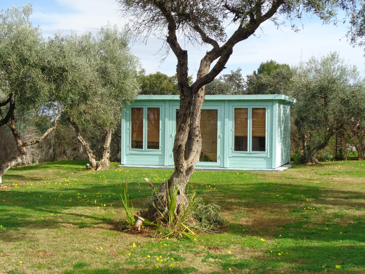 Passez le porche et vous accéderez à la vaste oliveraie gazonnée. Un atelier en bois, équipé d'électricité, de climatisation et d'éclairage, se trouve également à proximité. Il est idéal comme maison d'été, pour les loisirs créatifs ou comme refuge confortable.