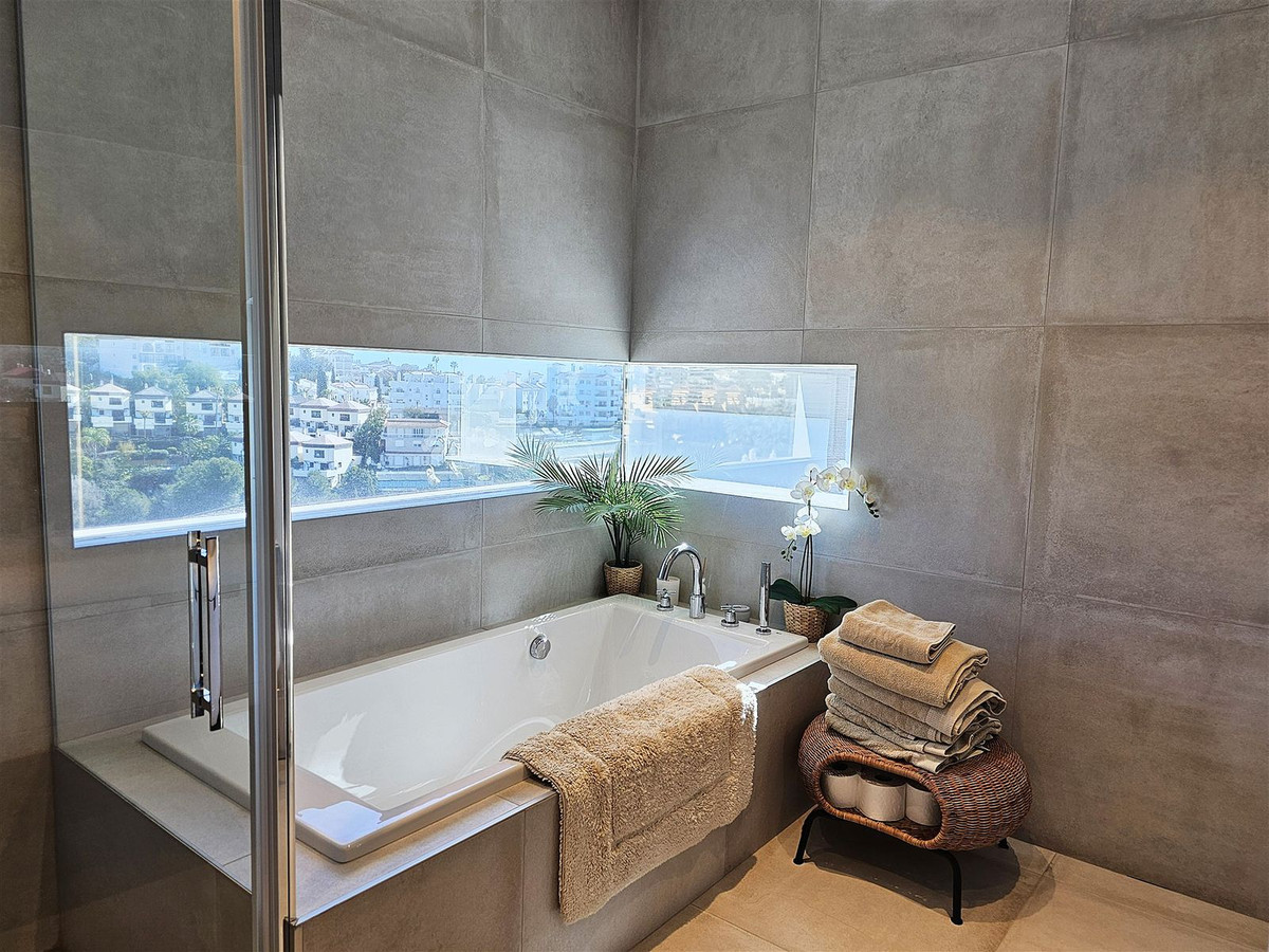 Achevée en 2021, cette magnifique villa contemporaine de 5 chambres et 5 salles de bain (dont une salle d'eau) se situe au sein d'une résidence sécurisée dans la partie basse de Riviera del Sol, à seulement 1,2 km (15 minutes à pied) de la plage, des commerces et des restaurants de Riviera et de la ville voisine de Calahonda. Faisant partie d'un ensemble exclusif de seulement 12 villas, la propriété bénéficie d'une vue imprenable sur la mer et le golf, dans un cadre paisible et pourtant très pratique.