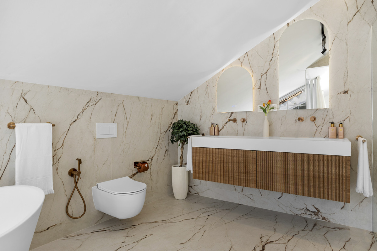 Un confort optimal est assuré toute l'année grâce au chauffage au sol dans toute la propriété, avec des zones de chauffage individuelles et trois systèmes Daikin qui régulent la température à chaque étage. Un système de sécurité préinstallé, des matériaux haut de gamme et une palette harmonieuse de couleurs et de textures créent une impression de qualité et de sérénité intemporelle.