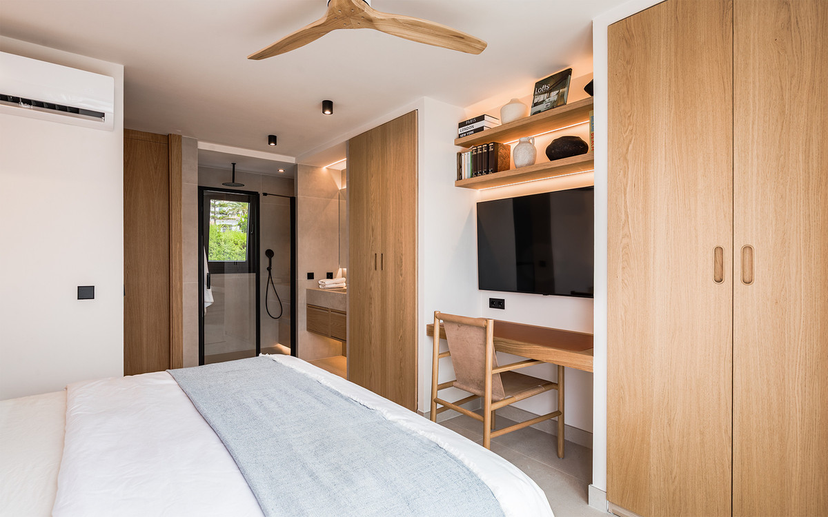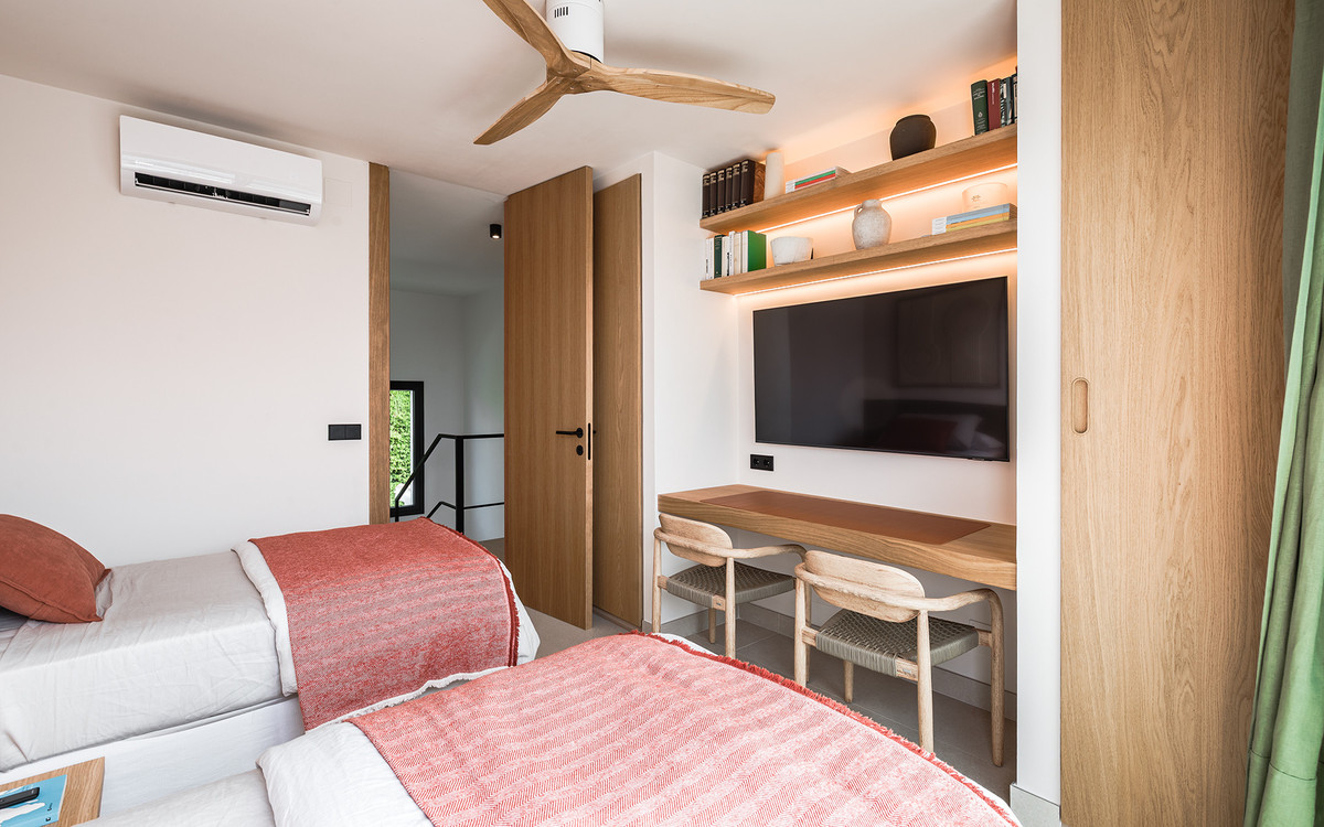Villa exclusive au design moderne et aux subtiles touches andalouses, située sur un terrain plat spacieux et privé à Huerta del Prado, à seulement 5 minutes en voiture de la plage, du centre commercial La Cañada et du Golden Mile de Marbella.
