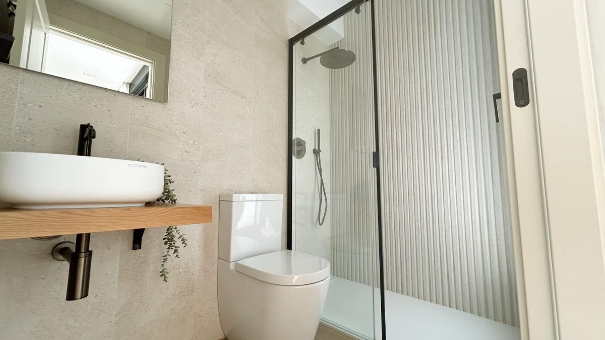 Main floor: Features a spacious, bright living room with a fully equipped open-plan kitchen, designed for both functionality and modern aesthetics. The living area opens directly onto a generous terrace with a private garden and swimming pool, ideal for enjoying the Mediterranean lifestyle. This level also includes a stylish guest toilet and the main bedroom with an en-suite bathroom, allowing for convenient single-level living if desired.