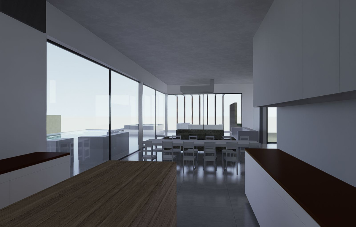 Rez-de-chaussée : Spacieux séjour-salle à manger avec cuisine ouverte et grandes fenêtres donnant sur la terrasse extérieure, ainsi que des toilettes pour invités.