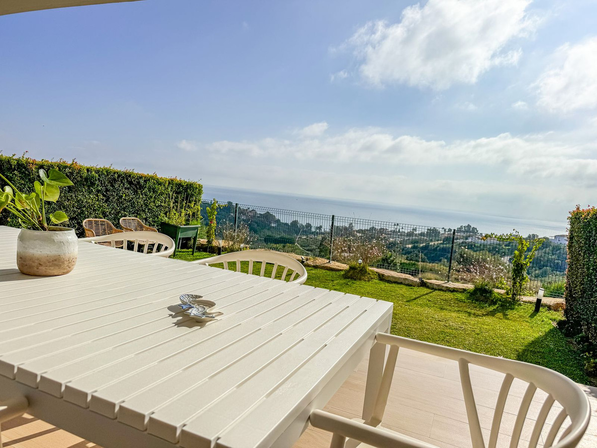 La terrasse, qui communique avec le séjour, est l'endroit idéal pour profiter du calme et de la nature. Elle comprend un coin repas extérieur et un espace détente pour se relaxer tout en admirant le coucher de soleil sur la Costa del Sol. Le jardin privé, entouré d'une végétation luxuriante, offre un espace extérieur parfait pour les loisirs.