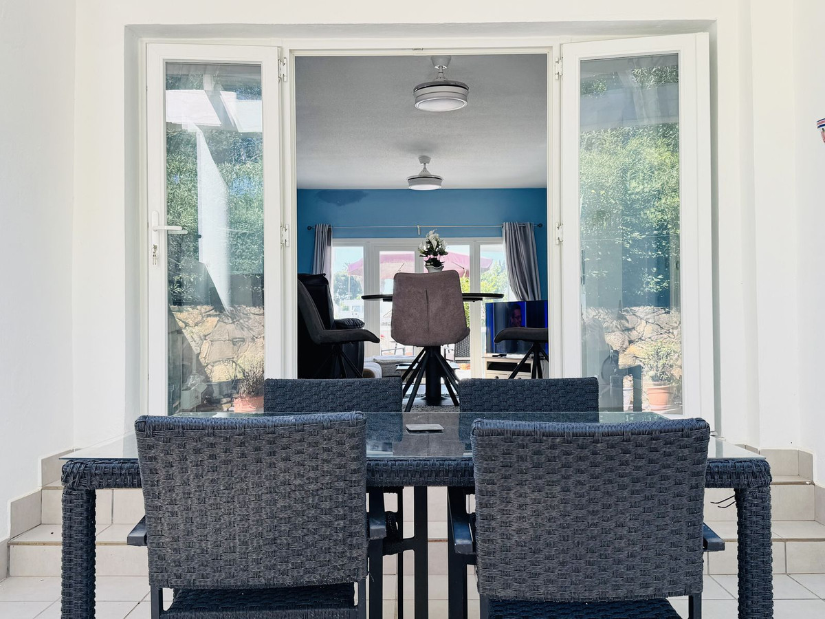 L'étage supérieur offre un espace polyvalent idéal pour un bureau ou une salle d'étude, ainsi qu'une grande terrasse ouverte offrant une vue imprenable sur le golf et la mer. L'ensemble de la maison a été rénové (électricité et plomberie) pour un confort moderne.