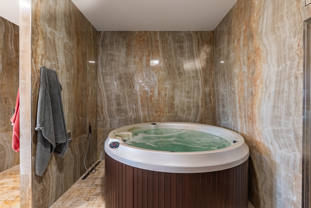 Un niveau inférieur entièrement dédié au bien-être est conçu comme un havre de paix privé, offrant une expérience de vie complète au sein même de la maison. Ce niveau comprend un espace spa avec sauna, hammam et jacuzzi, ainsi qu'une salle de sport entièrement équipée et baignée de lumière naturelle.
