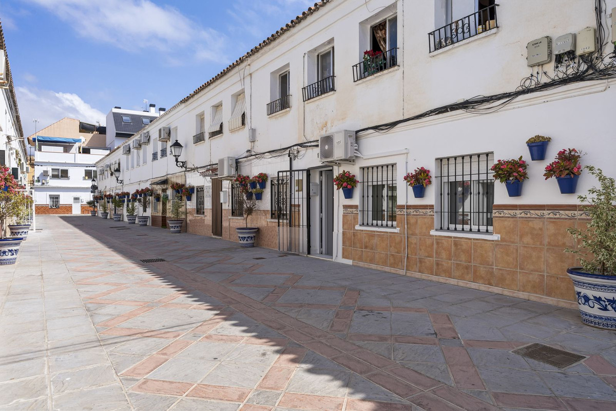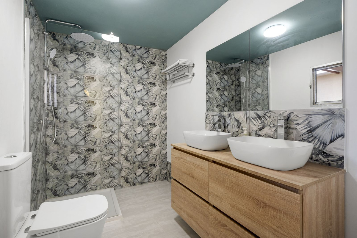 Profitez de votre propre patio couvert exposé plein sud, idéal pour bénéficier du soleil de l'après-midi, avec en plus un espace de rangement séparé. Un autre accès à la propriété se fait par le patio, donnant sur une rue avec parking. À l'étage, une terrasse privative sur le toit offre un espace idéal pour se détendre et profiter du soleil de la Costa del Sol.