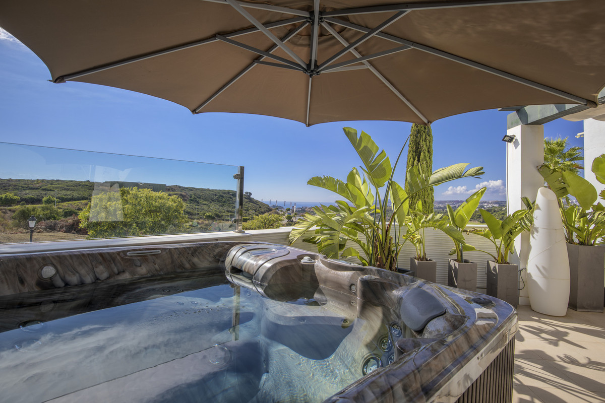 À l'avant, une terrasse extérieure fermée par des baies vitrées prolonge élégamment l'espace de vie principal, idéale pour en profiter toute l'année. Plus loin, une autre terrasse ouverte avec jacuzzi invite à la détente face à un panorama à couper le souffle. À l'arrière, une paisible terrasse donnant sur un jardin offre un espace intime pour se ressourcer. Parmi les autres atouts, citons la climatisation, de nombreux rangements, un bureau, un parking privé, un grand cellier et l'accès à la piscine, aux jardins et à la salle de sport communs de la résidence.