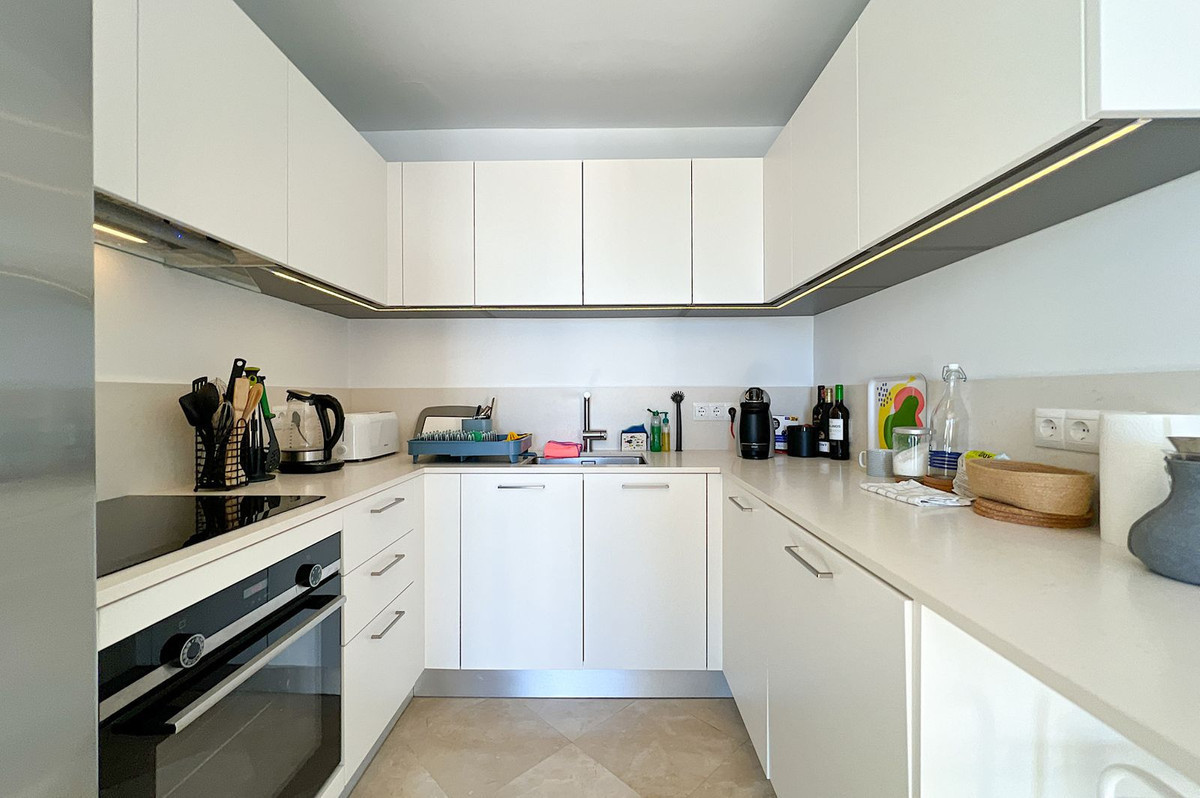 La cuisine a été entièrement rénovée avec des matériaux et un design de la plus haute qualité ; un des murs a été modifié pour agrandir encore le salon.