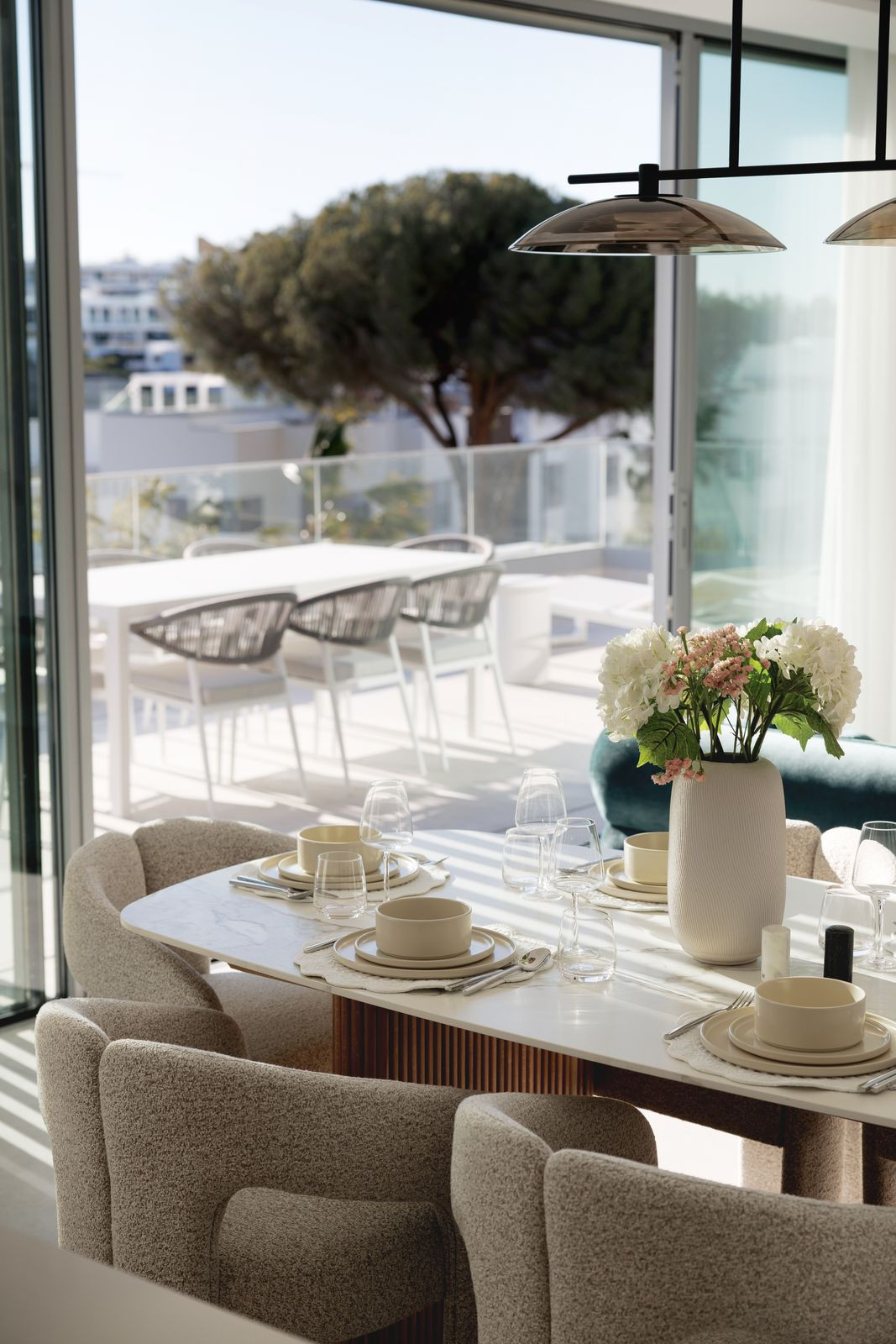 The true highlight of this penthouse is the impressive 128 m² of terraces, designed for both relaxation and entertaining, featuring a private swimming pool, stylish lounge areas, a covered outdoor dining space, and open views over landscaped gardens and modern architecture. The east-facing orientation allows for soft morning light and pleasant temperatures throughout the day, making the outdoor areas enjoyable year-round.