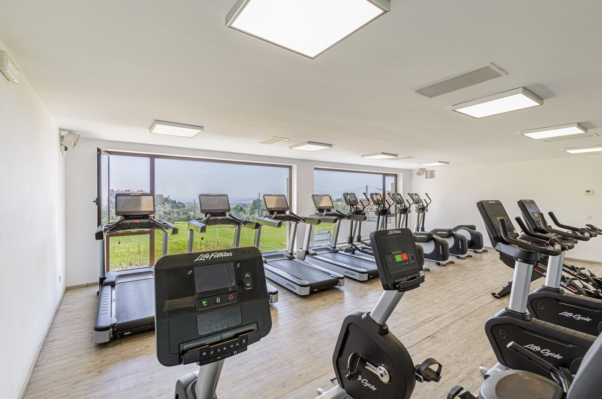 Salle de fitness ultramoderne : une salle de sport moderne et entièrement équipée, offrant une vue panoramique depuis la zone cardio, une salle de musculation dédiée et un studio de fitness collectif.