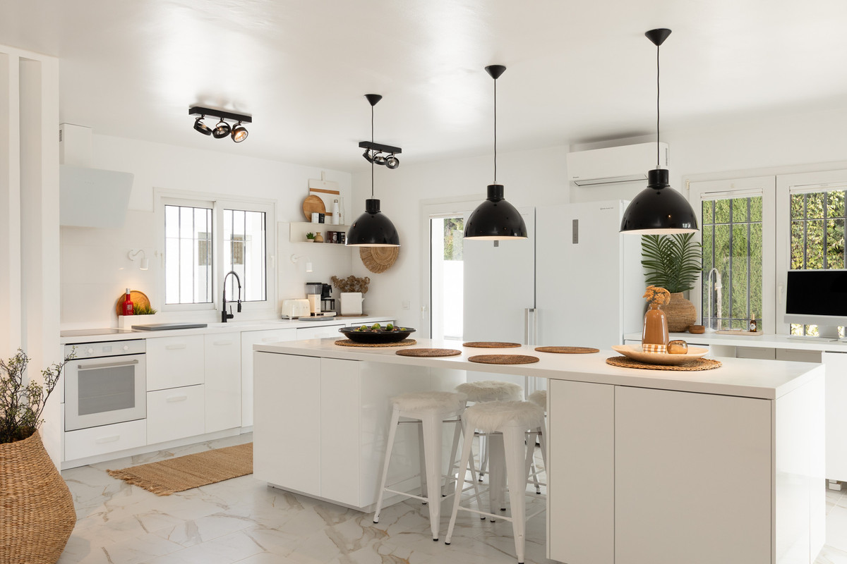 Cette magnifique maison familiale andalouse, entièrement rénovée, dégage une élégance discrète et sereine. Dès l'entrée, elle offre une vue imprenable sur la mer Méditerranée. Le niveau principal, conçu pour une transition fluide entre intérieur et extérieur, comprend une cuisine ouverte sur la salle à manger et le salon, qui s'ouvre directement sur une vaste terrasse couverte. De là, la vue embrasse la piscine, le golf et la Méditerranée, créant un cadre idéal pour des matins paisibles comme pour des moments de détente entre amis.