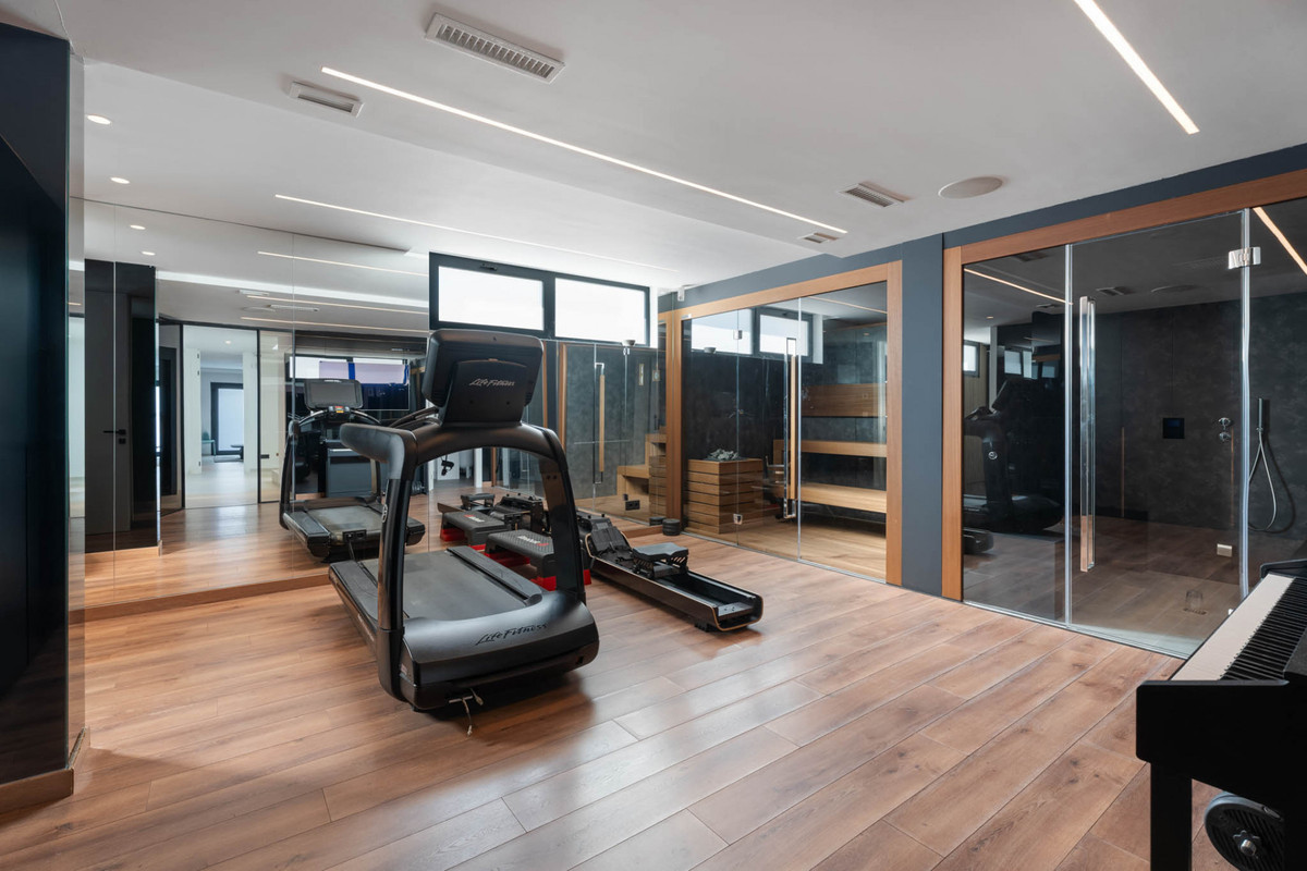 Équipements : Terrasse couverte, Ascenseur, Placards intégrés, Terrasse privée, Solarium, Wi-Fi, Salle de sport, Sauna, Salle de jeux, Appartement d'invités, Salle de bains privative, Sol en marbre, Jacuzzi, Barbecue, Double vitrage, Domotique, Sous-sol, Fibre optique