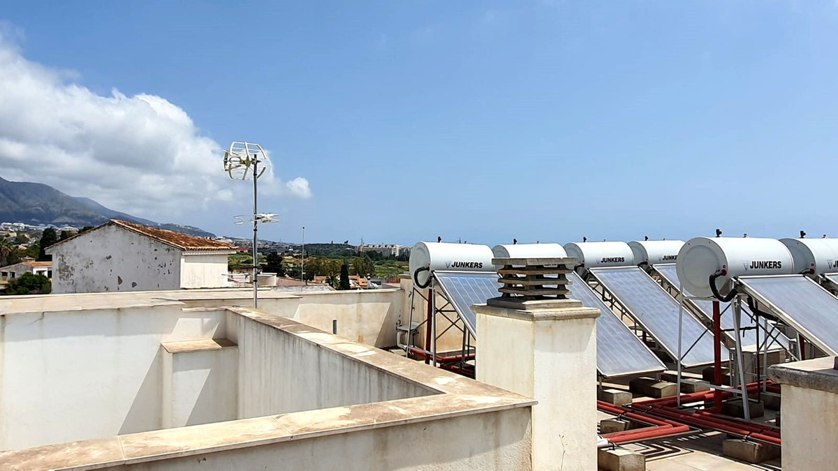 L'un des atouts majeurs de cette propriété est son vaste solarium privé sur le toit, accessible par un escalier classique. Une partie de cet espace est actuellement aménagée en bureau, offrant ainsi une grande flexibilité d'aménagement : il est possible d'agrandir la partie couverte ou de la transformer en une terrasse entièrement ouverte. De là, on profite d'une vue dégagée agréable sur les montagnes et d'un aperçu de la mer, créant ainsi un cadre extérieur propice à la détente.